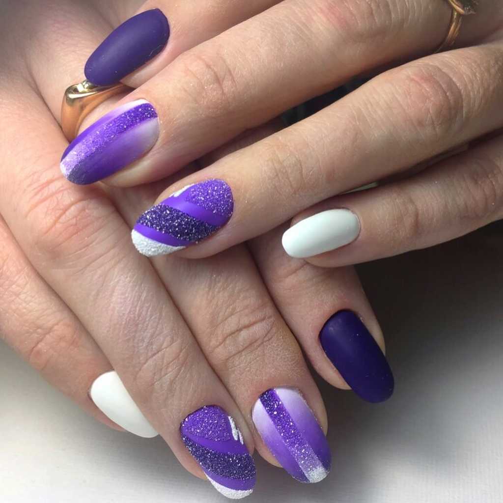 Сочетание фиолетового с белым — классика жанра, простая и понятная в любых проявлениях. Такое единение цвета уместно во французском маникюре, а также при создании витиеватого рисунка на одном или нескольких ноготках.