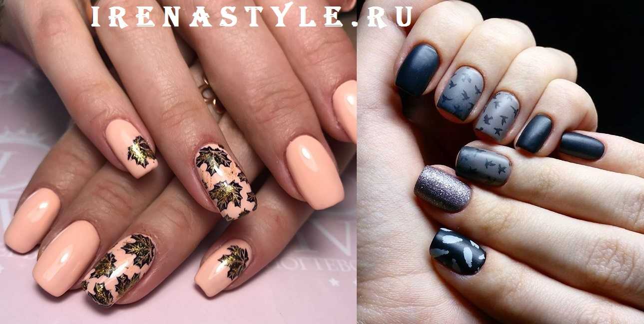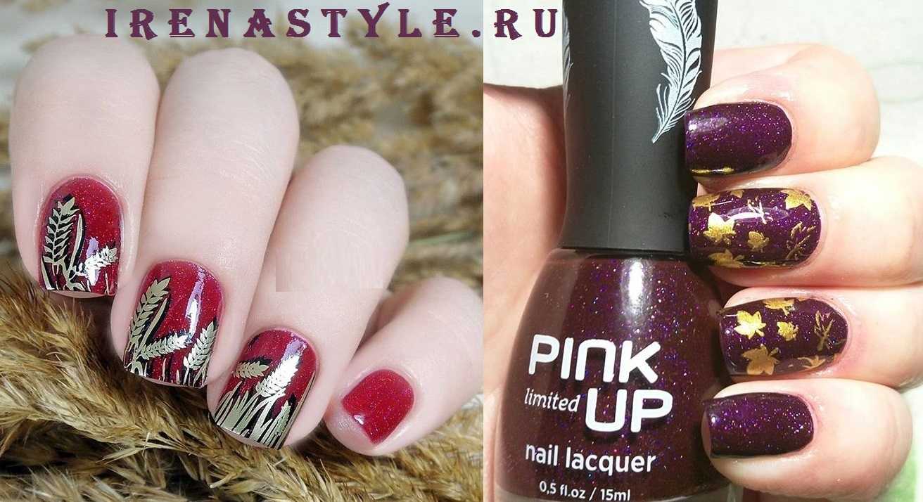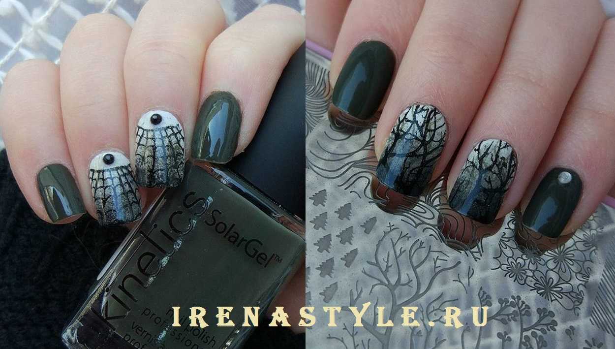 Современный молодежный вариант, которые подразумевает нанесение изображений и силуэтов девушек. Исполнить сложные рисунки позволяет техника стемпинг. Эффектность придает матовая основа и поталь. Дополнить можно принтом цветов, веток и листьев.
