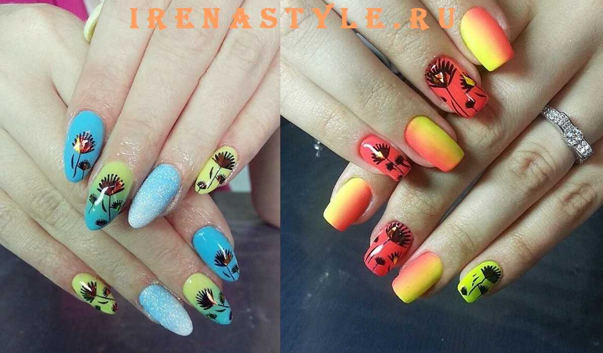 - Цветы. Еще один универсальный маникюр, который уместен в любое время года и на ногтях любой длины. Например сегодня такие узоры наносят под матовое топовое покрытие.