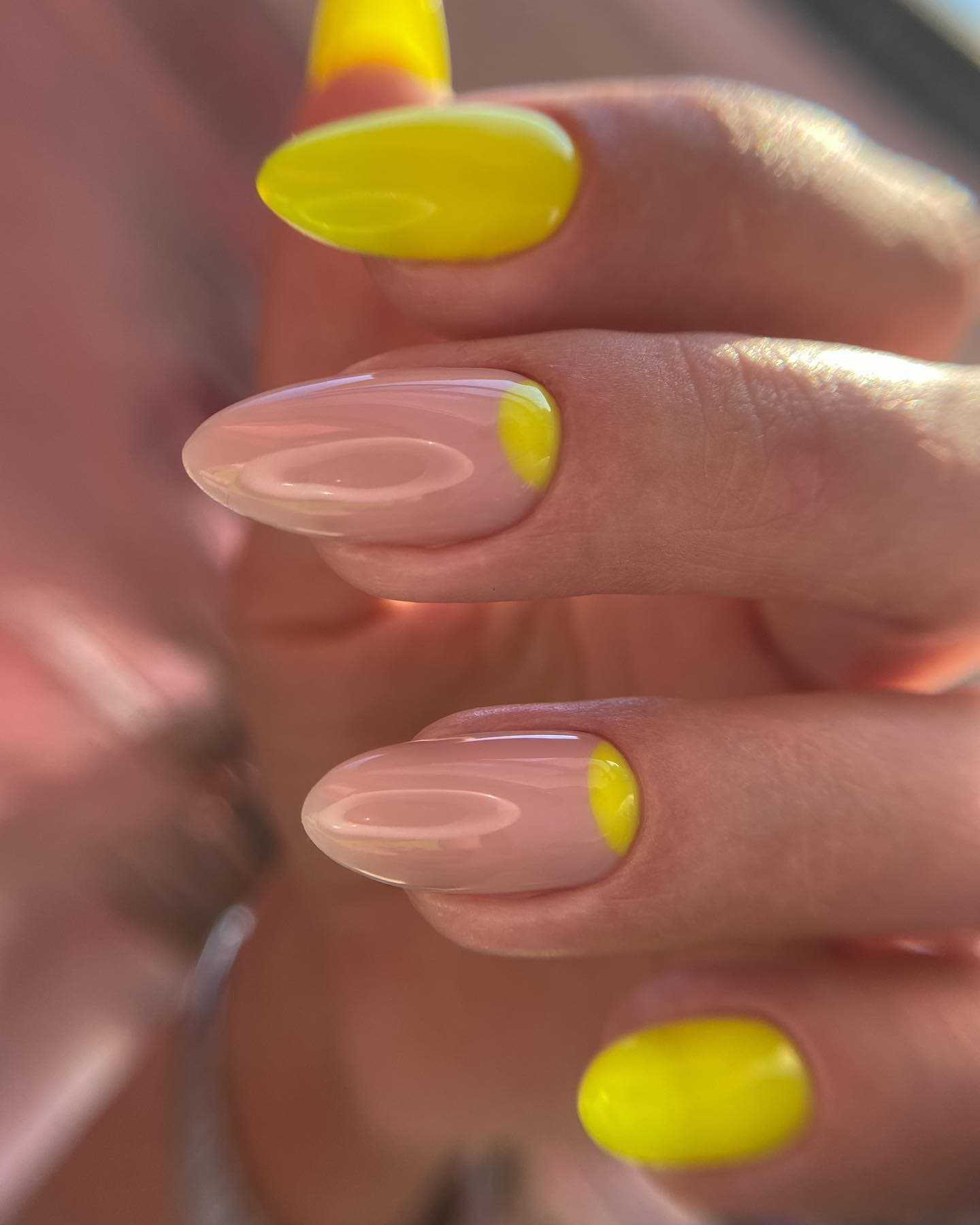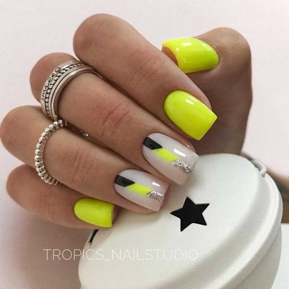 - Хочешь быть оригинальнее. Чаще всего ногти красят либо в нюдовые цвета, либо в строгую базу — черный, белый, серый, красный. Да, такие оттенки подойдут практически ко всему, но ведь и смотрятся они уж слишком обыденно. То ли дело желтый! А если душа лежит к экспериментам, самый “безопасный” способ привнести что-то новое в свой образ: попробовать тренд на маленьком участке — например, ногтях.