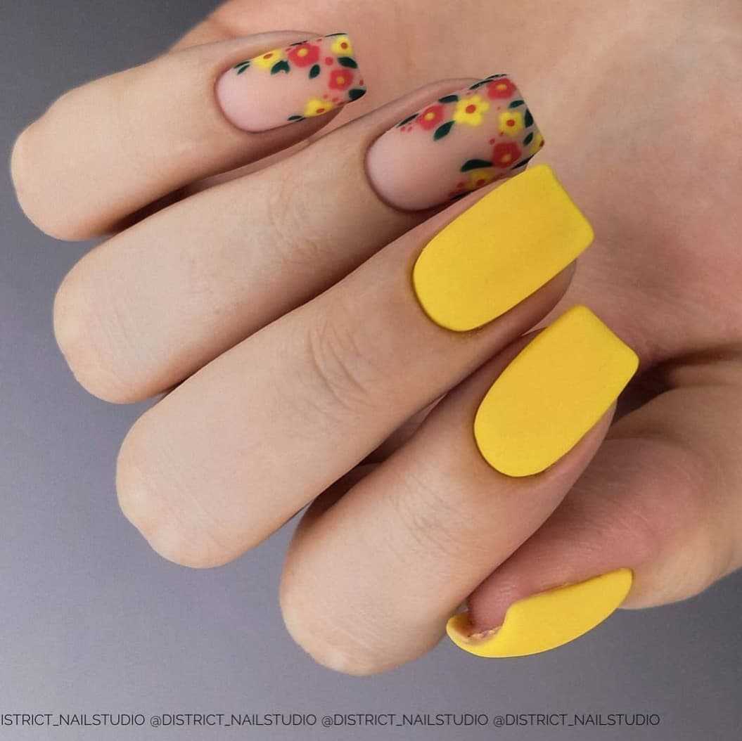 Без цветочного декора не обходится ни один современный и стильный нейл-арт. Это универсальное решение для любой формы ногтей. Что касается узора, то чаще всего дизайн дополняется не классическими цветами, а тонкими веточками с листьями в черном цвете, листьями монстеры, тростника, лавра и т.д.
