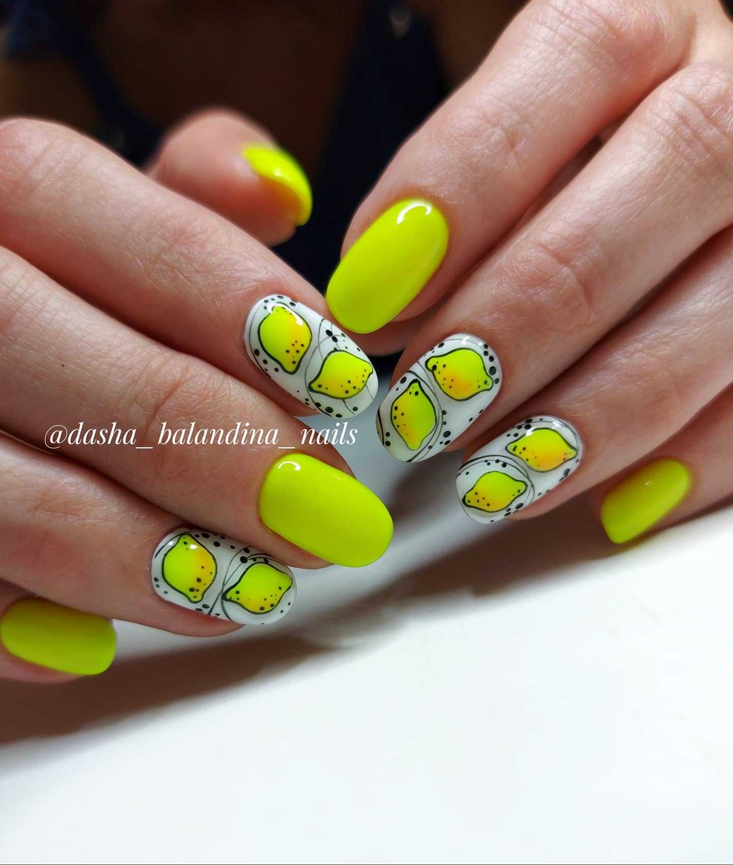 Насыщенный травянистый маникюр превосходно гармонирует не только с рисунками фруктов, но и со стемпингом, геометрией, растительными мотивами. К примеру, очень интересно будут смотреться пальмовые ветви или листья монстеры.