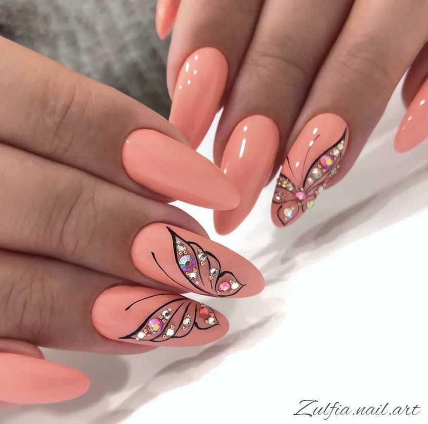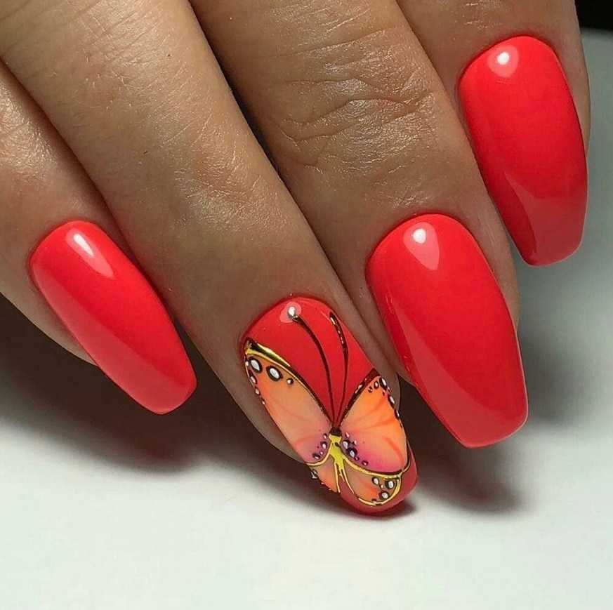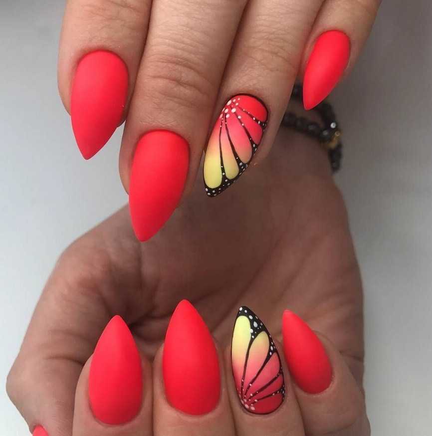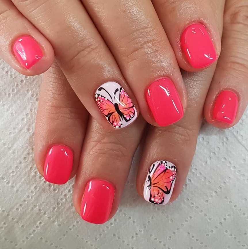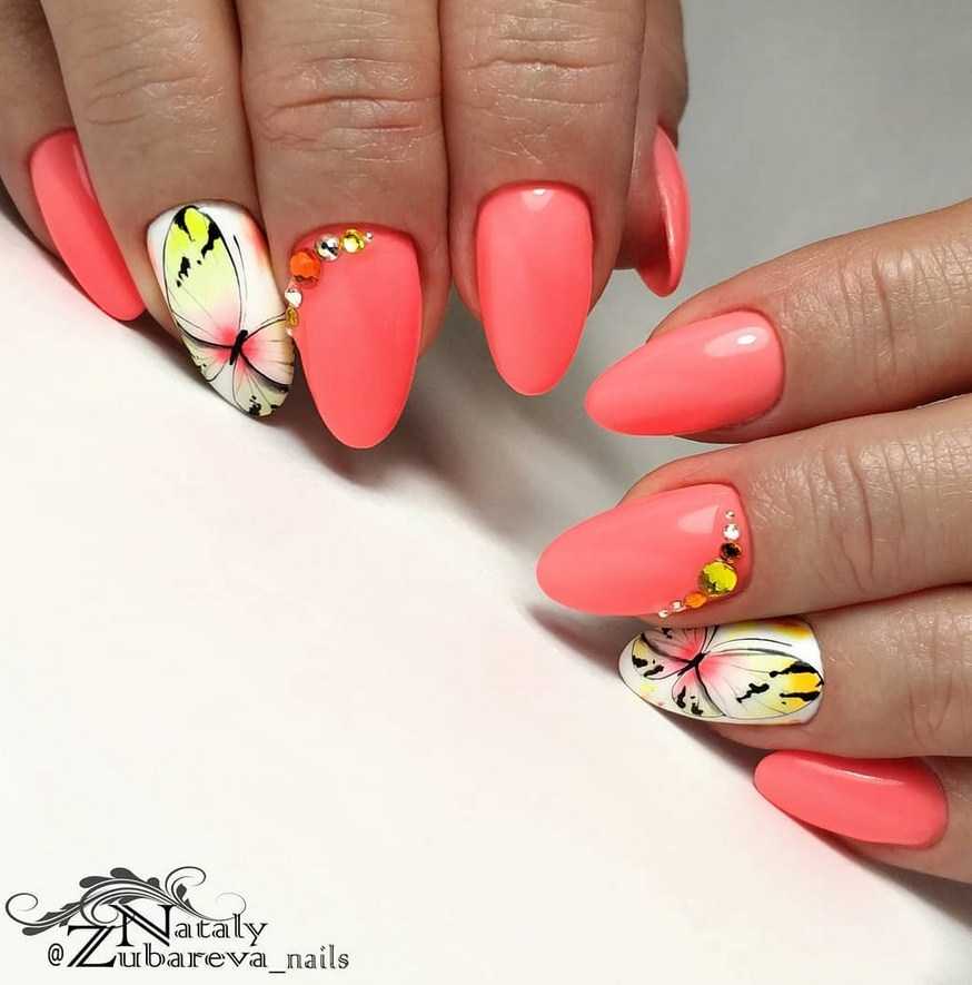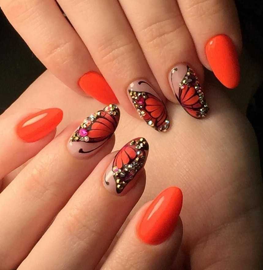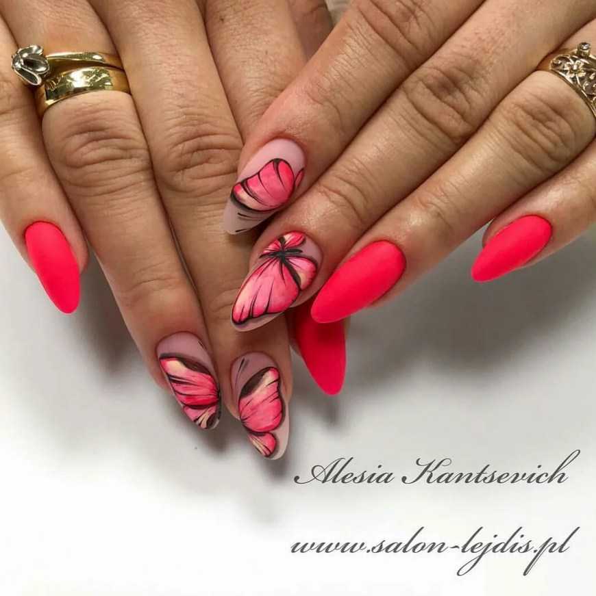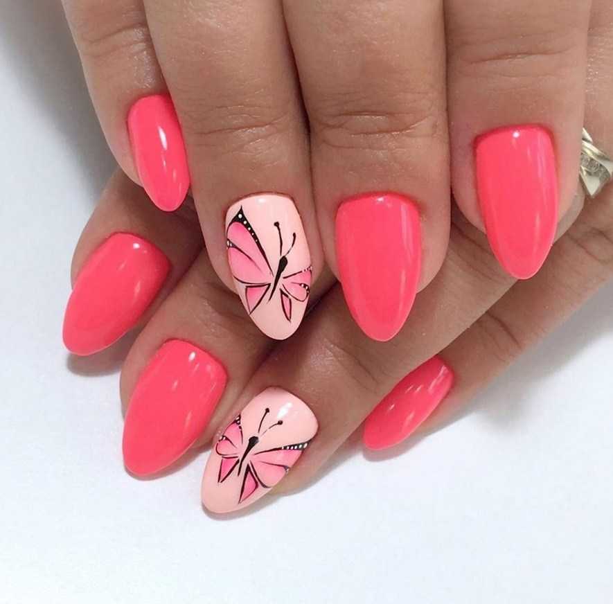 Рисунки насекомых на ноготках никогда не выходят из моды. В 2023 будут актуальными яркие изображения бабочек, выполненные сочными тонами, либо обратная вариация нейл-арта (коралл на светлом фоне).