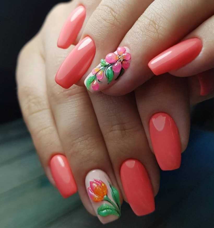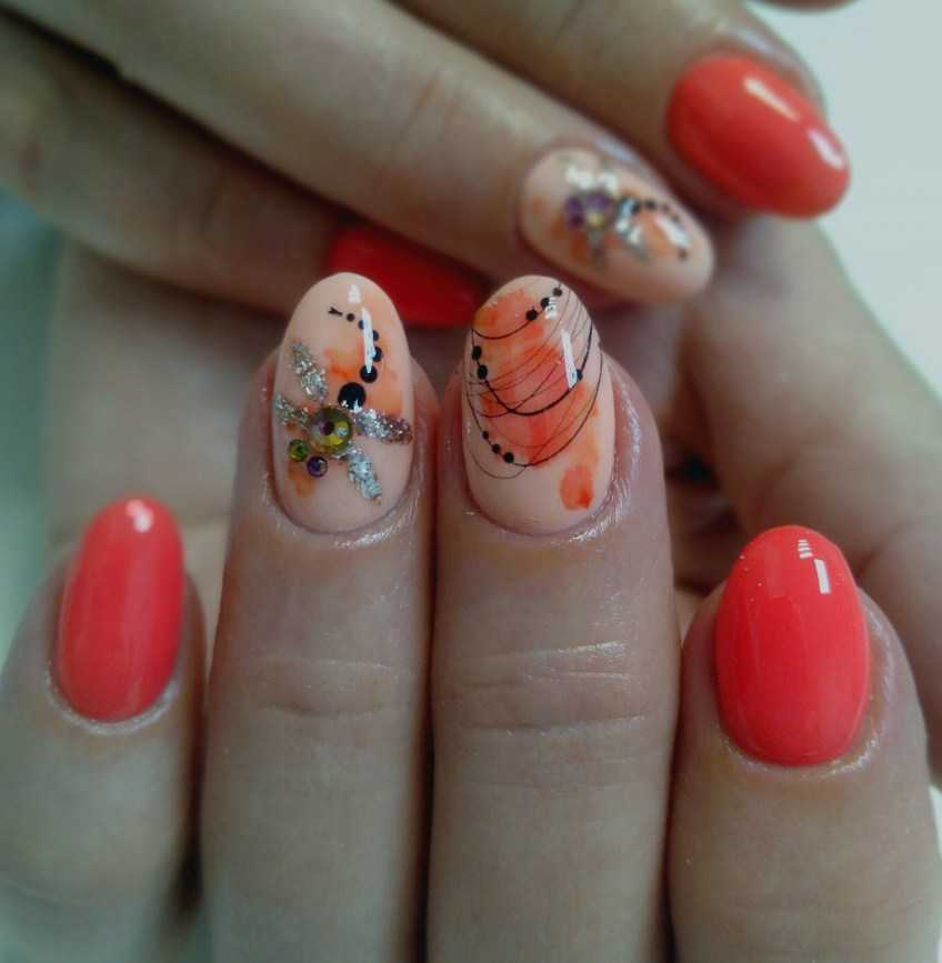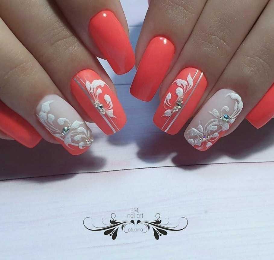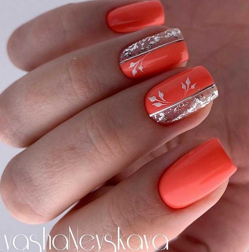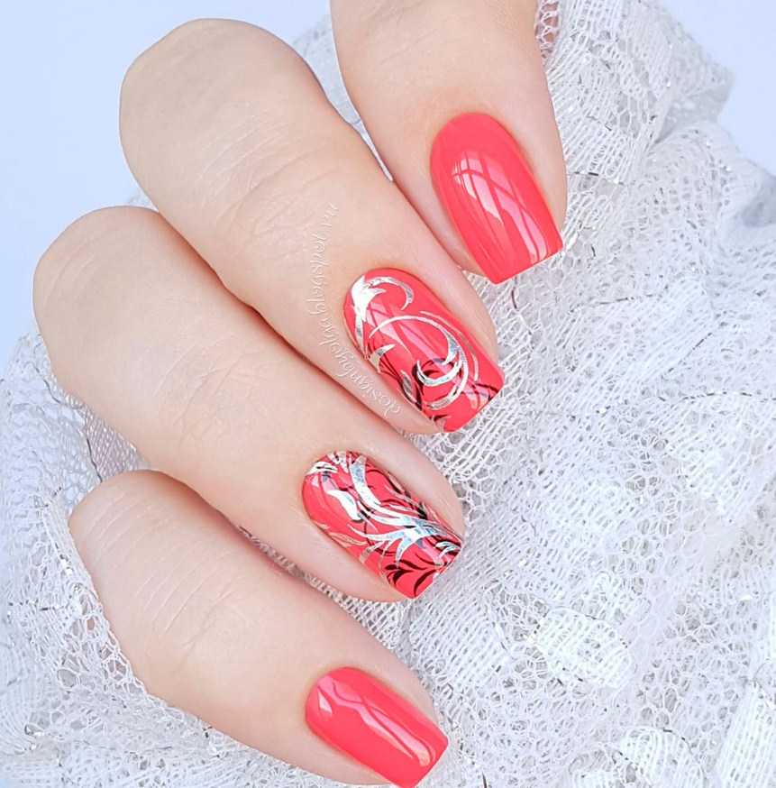 Оттенки коралла особенно хорошо выглядят на загорелой коже, могут применяться в самых простых и в сложных вариантах дизайна. Большинство самых модных техник, появившихся недавно, прекрасно подходят для оттенков этой гаммы и дают эффектный результат.