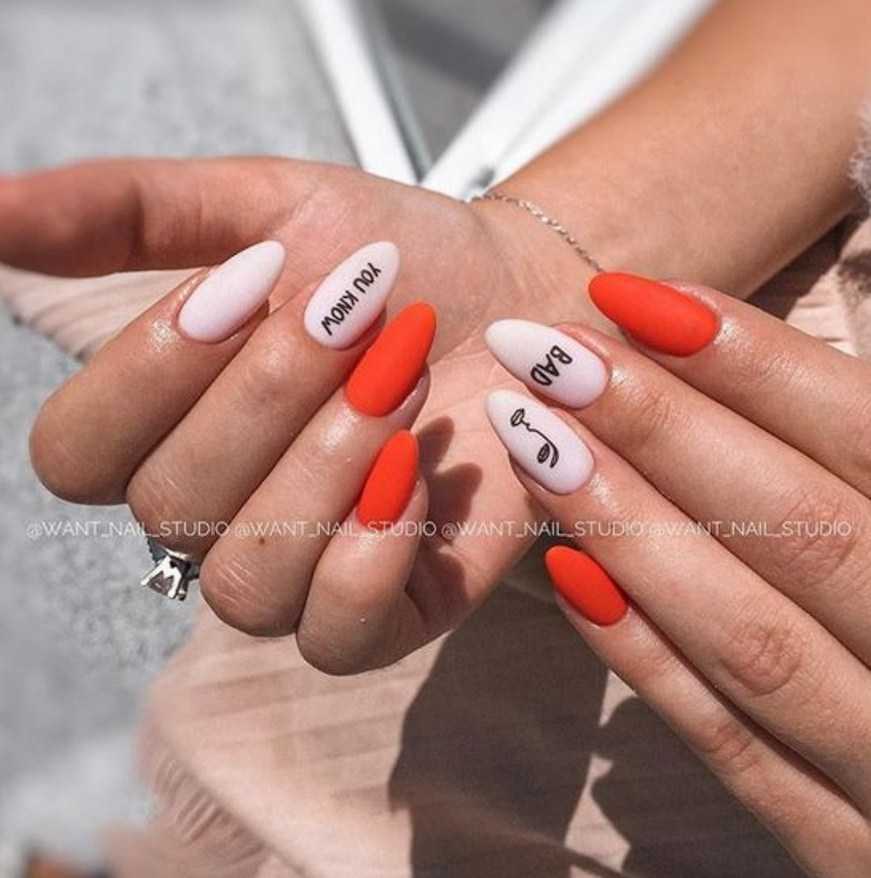 Настоящей изюминкой образа станет оригинальная надпись на одном или двух ногтях на руке. Сделать её лучше максимально контрастной, заметной и в том стиле, который будет перекликаться с общим образом.