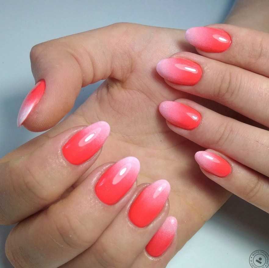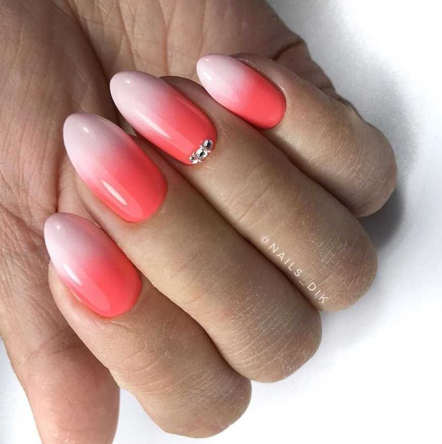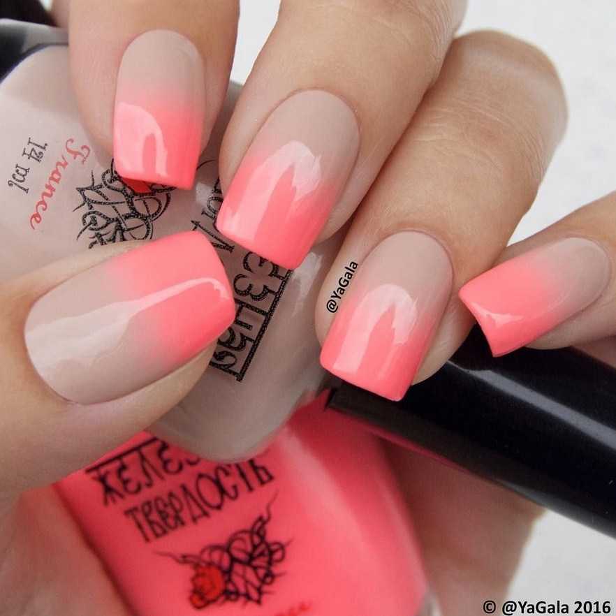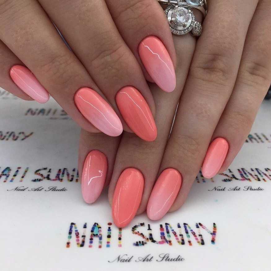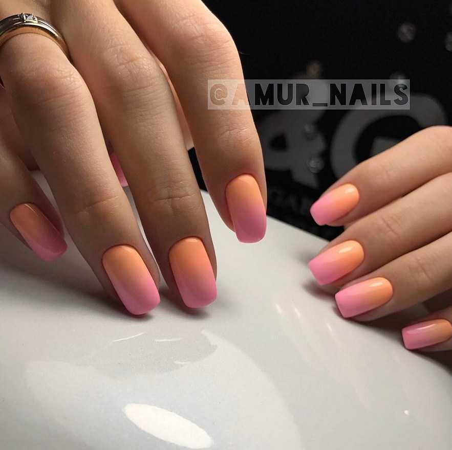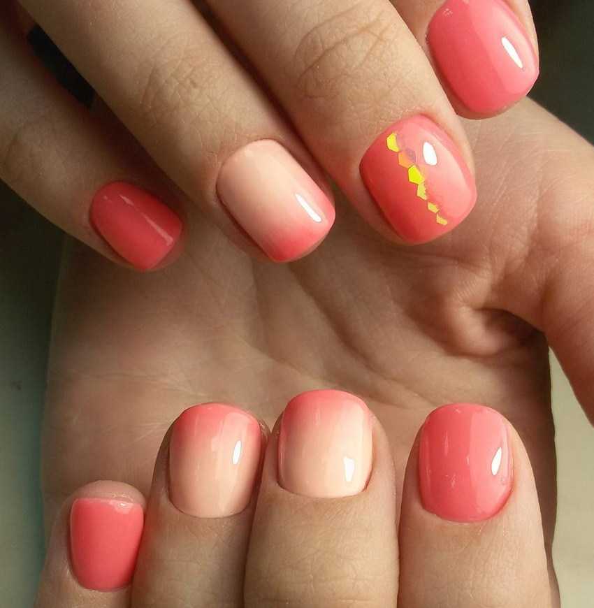 Для всех персиковых, розовых, оранжевых и других «летних» оттенков идеально подходит техника плавных переходов на ногтях, причём как вертикальных, так и горизонтальных. Можно подобрать от 2 до 5 смежных тонов или взять пару контрастных оттенков – результат будет потрясающим.