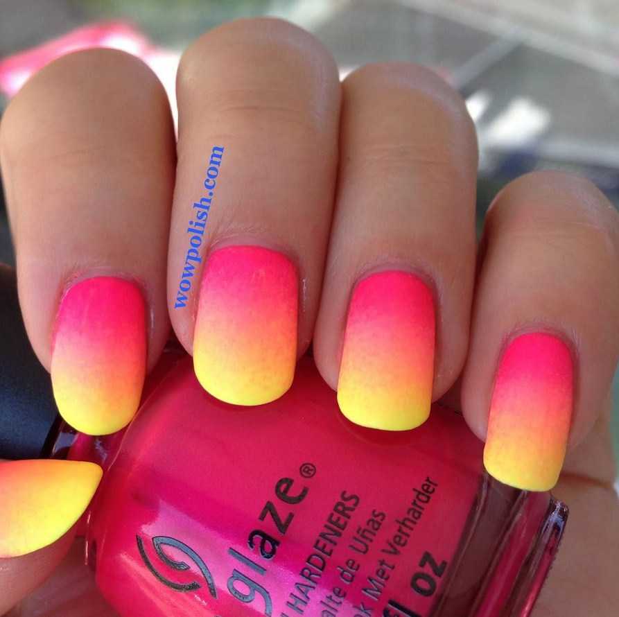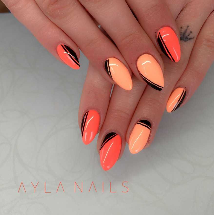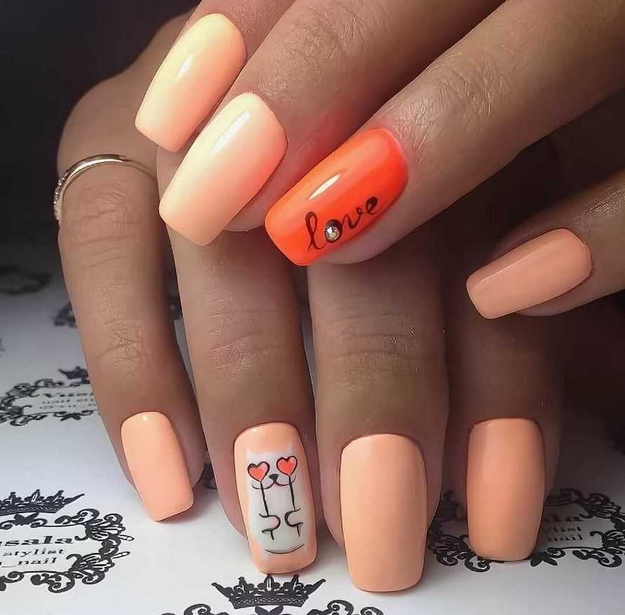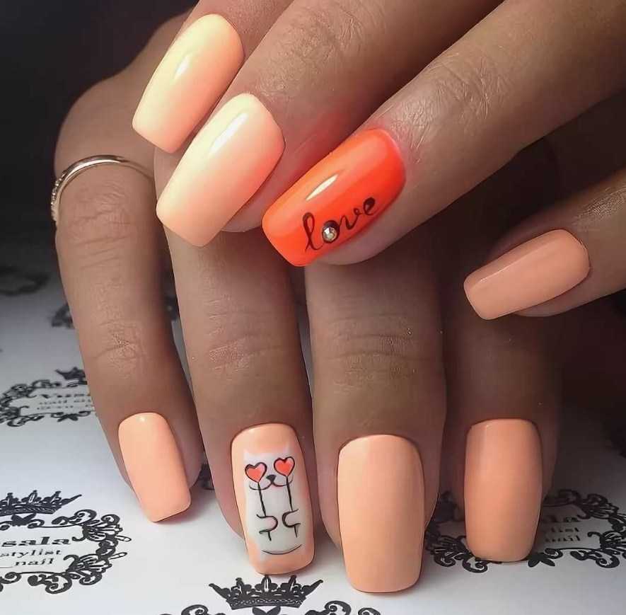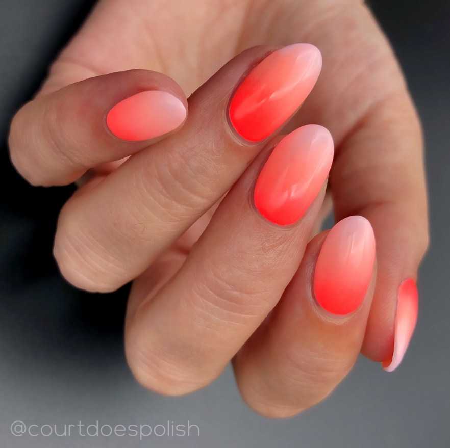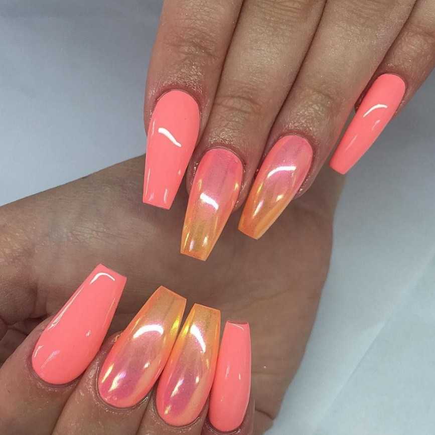 Для всех персиковых, розовых, оранжевых и других «летних» оттенков идеально подходит техника плавных переходов на ногтях, причём как вертикальных, так и горизонтальных. Можно подобрать от 2 до 5 смежных тонов или взять пару контрастных оттенков – результат будет потрясающим.