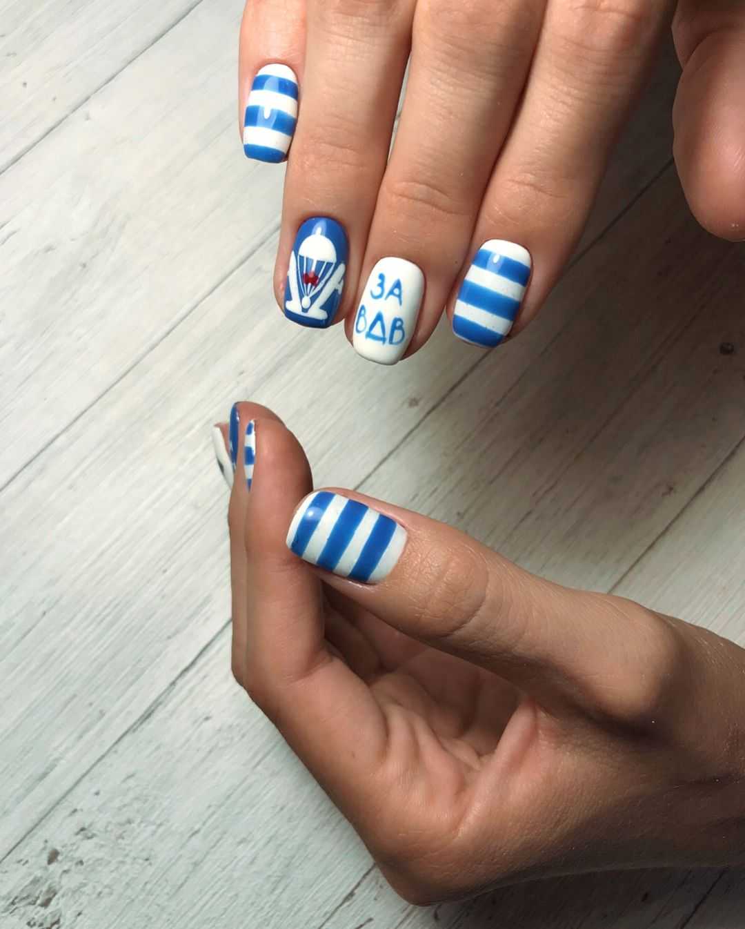 Например, один или два акцентных пальца можно стилизовать под бело-голубую тельняшку. Другие – покрыть лаками, которые по цвету совпадают с беретом и самой формой военных.