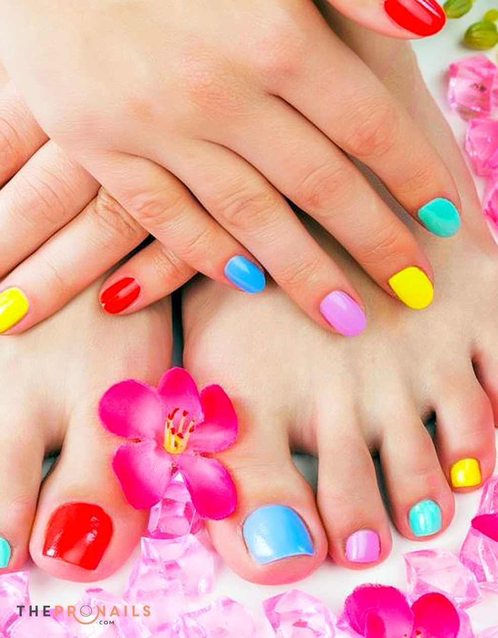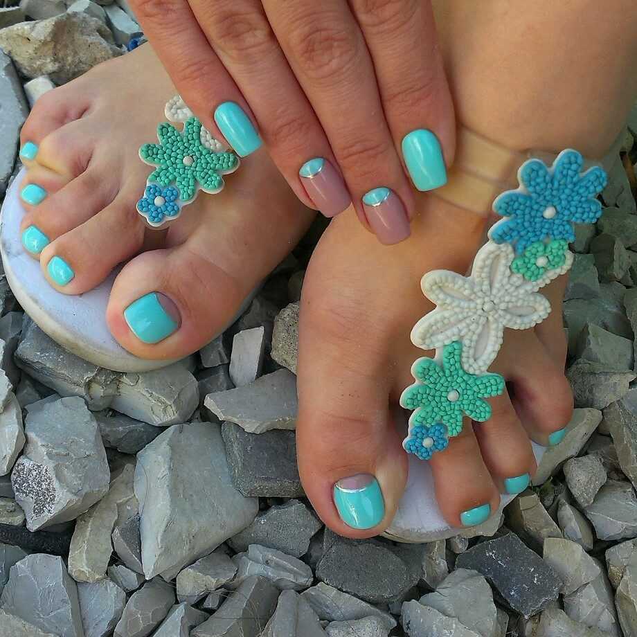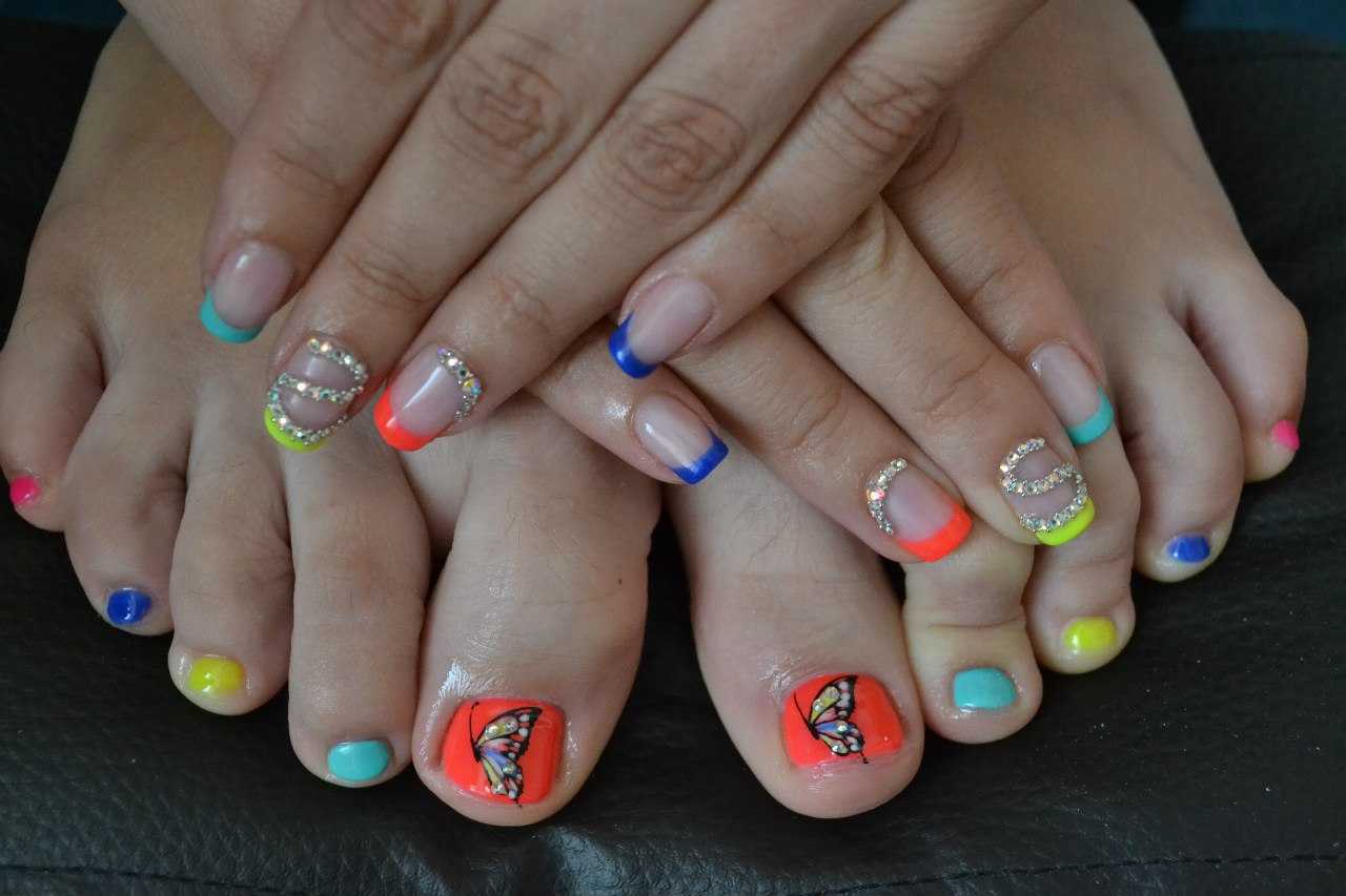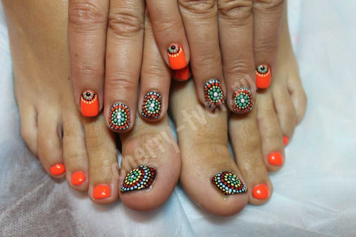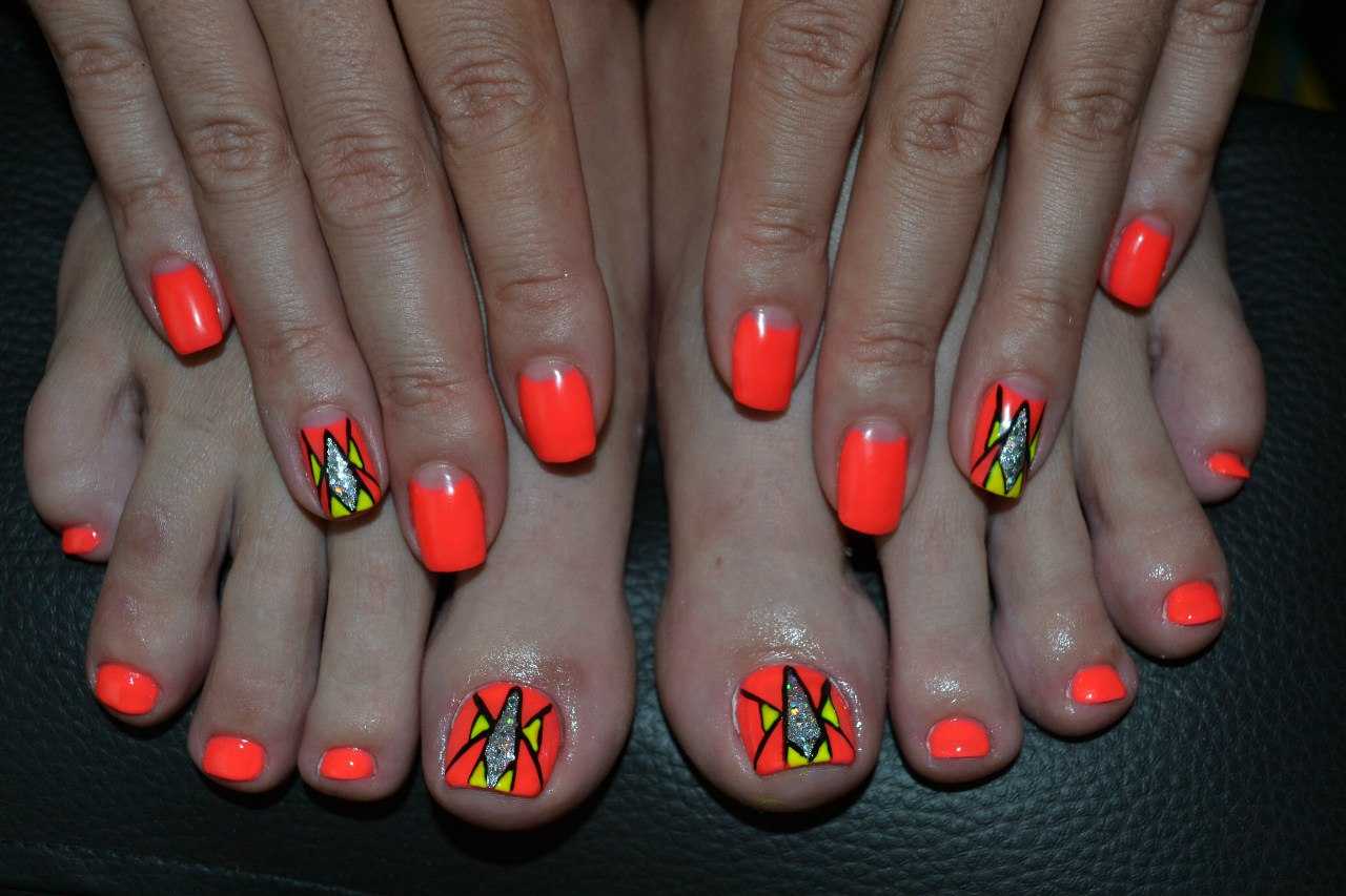 Яркий маникюр и педикюр в одном стиле смотрятся очень эффектно. Вы можете выбирать любые сочетания цветов и украшения. Чаще всего яркие оттенки выбирают в летний сезон. Но в другие времена года такое оформление ноготков будет смотреться не менее круто.