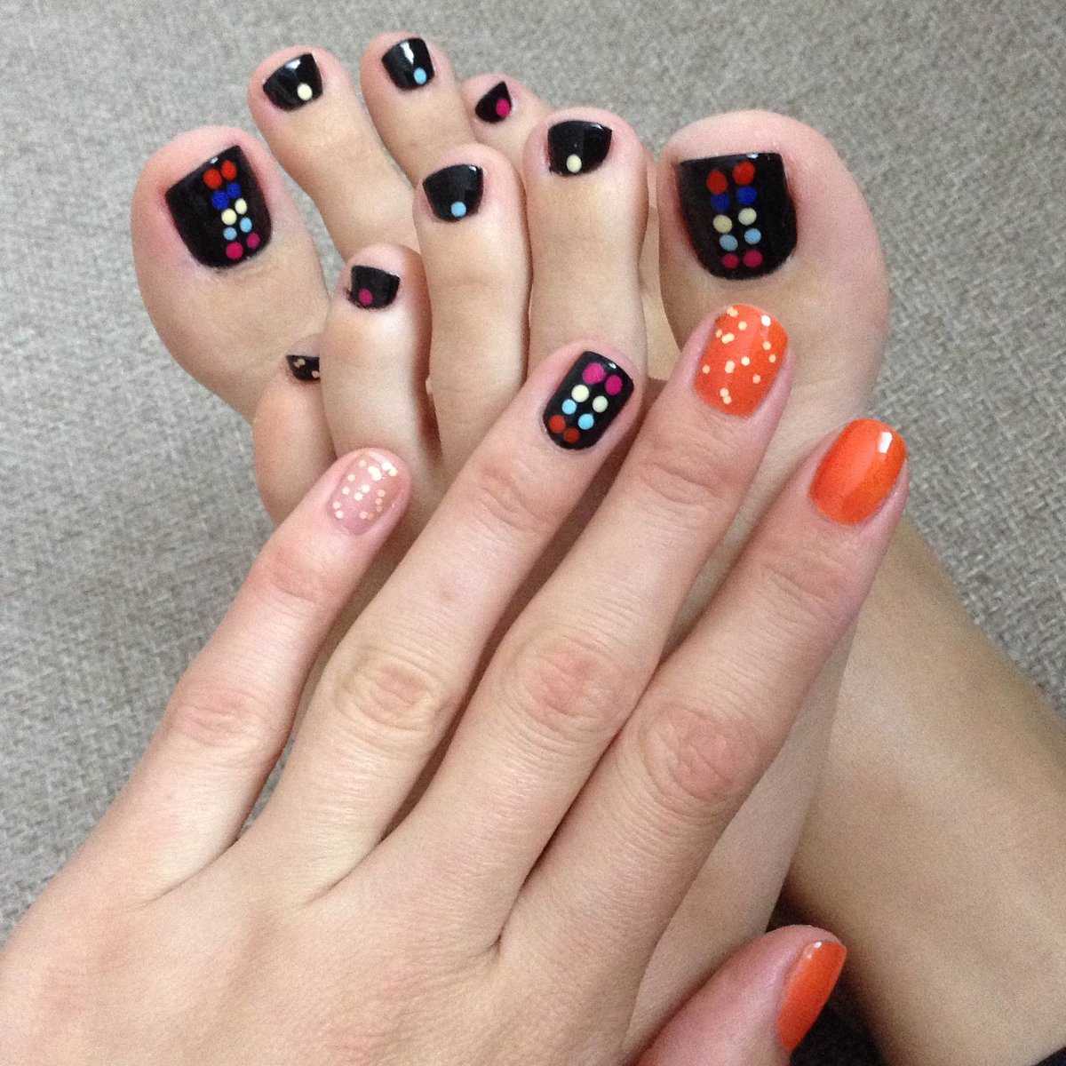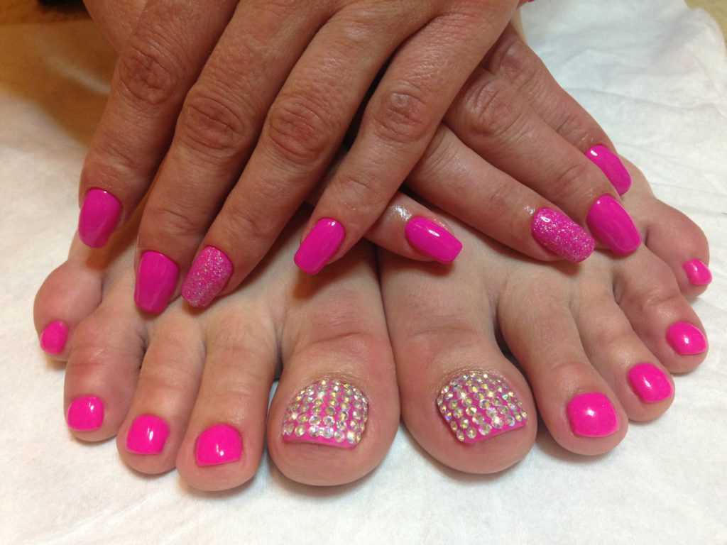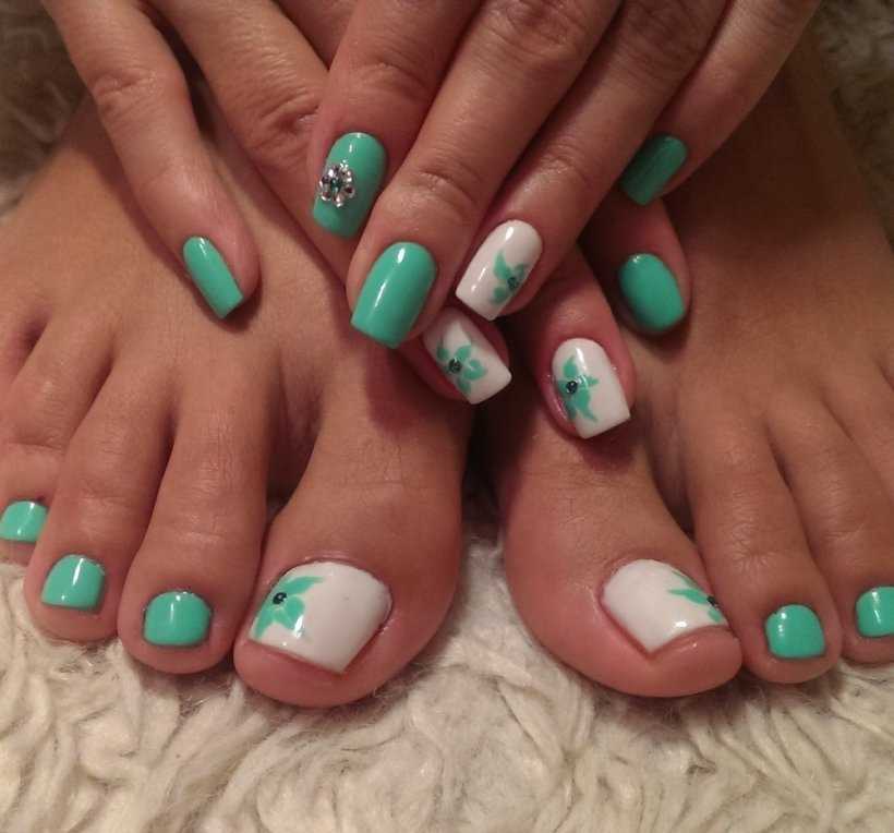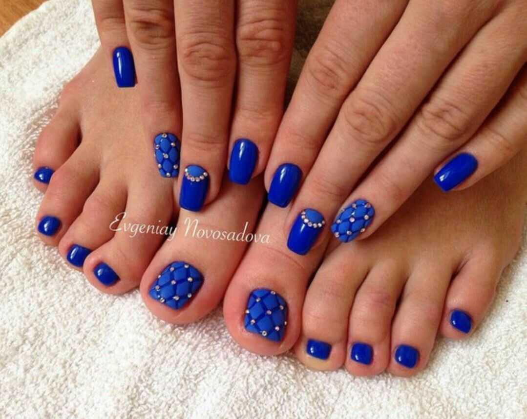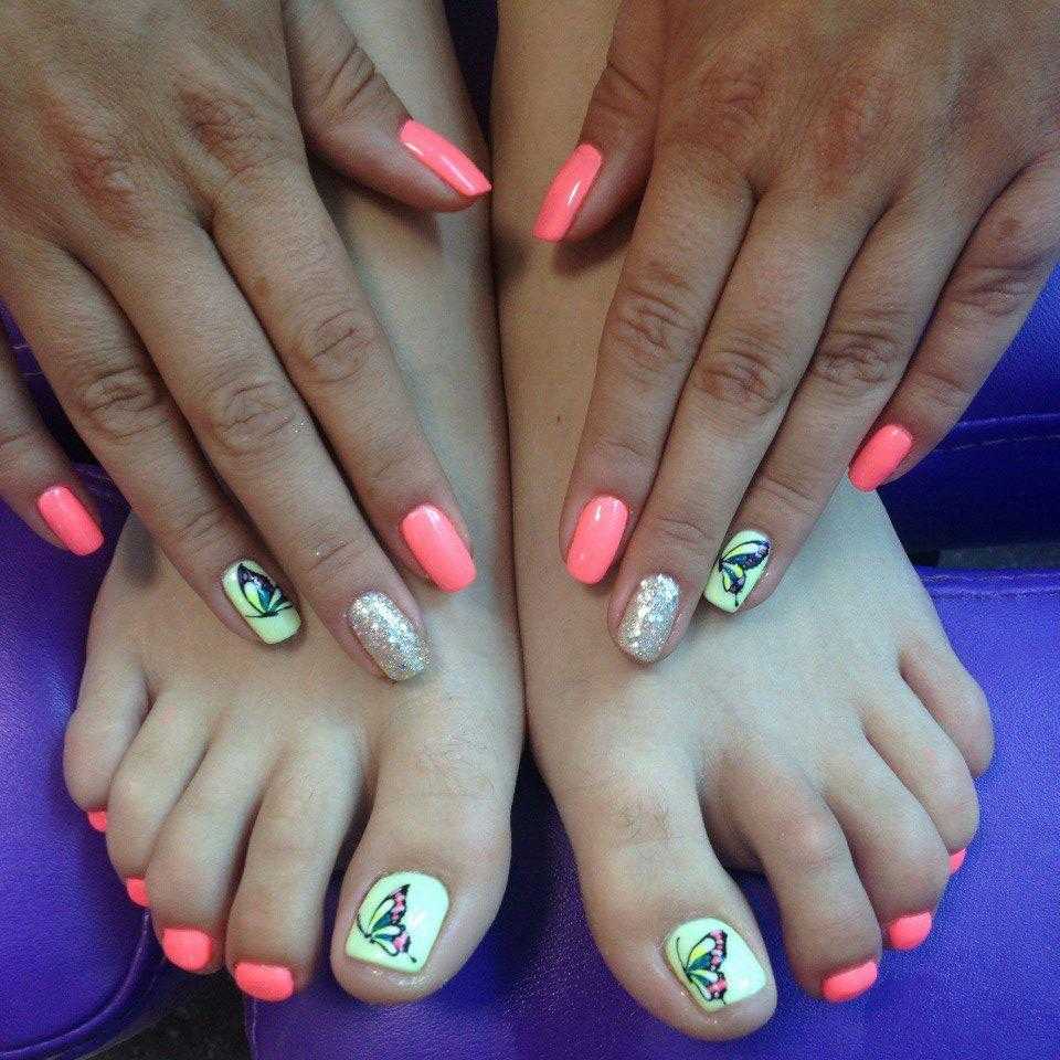 Яркий маникюр и педикюр в одном стиле смотрятся очень эффектно. Вы можете выбирать любые сочетания цветов и украшения. Чаще всего яркие оттенки выбирают в летний сезон. Но в другие времена года такое оформление ноготков будет смотреться не менее круто.