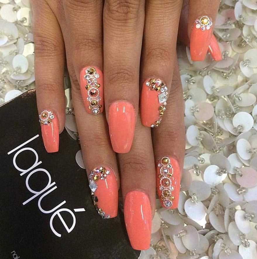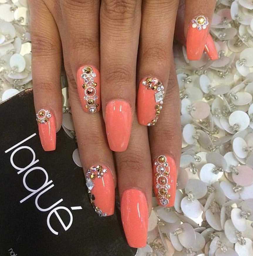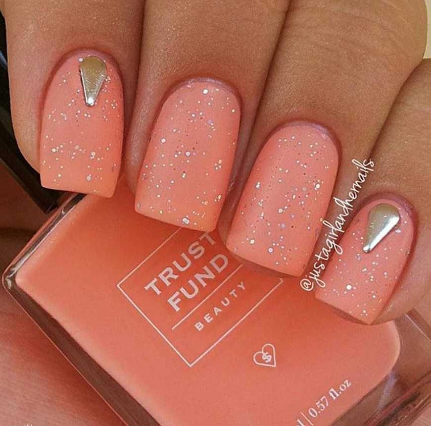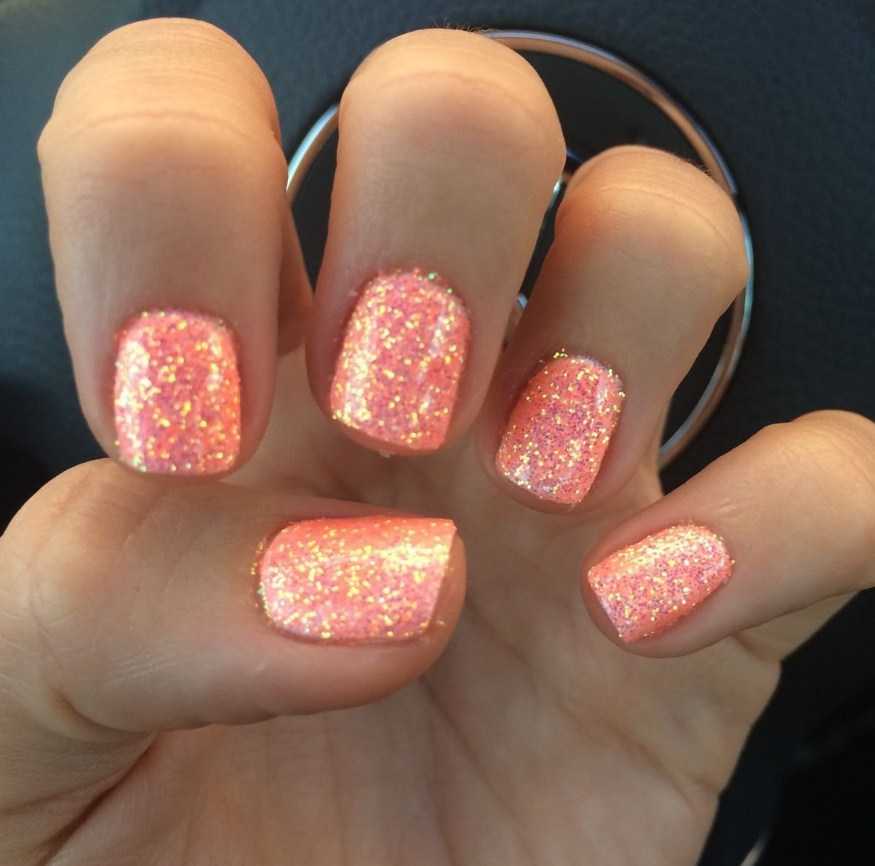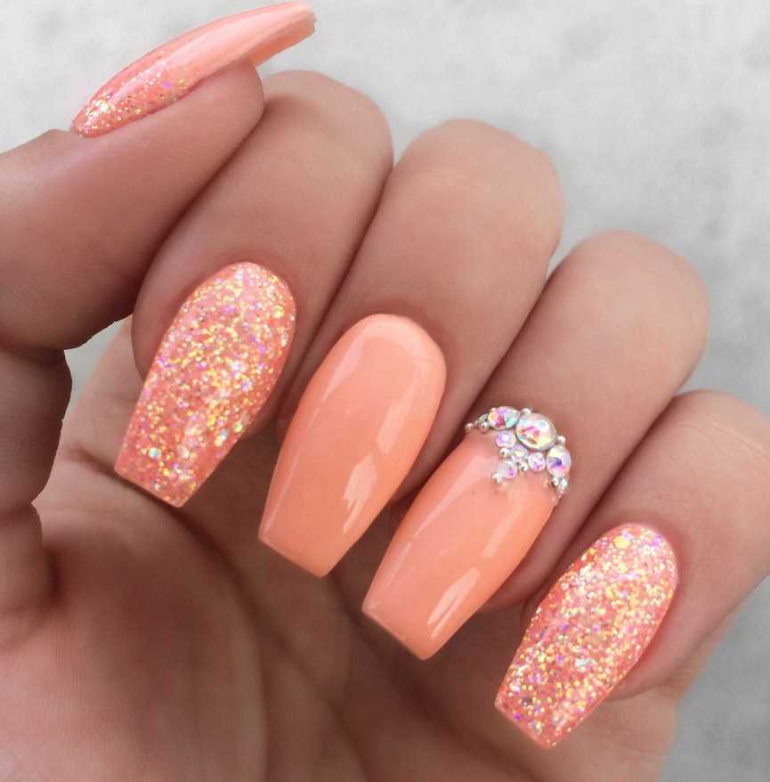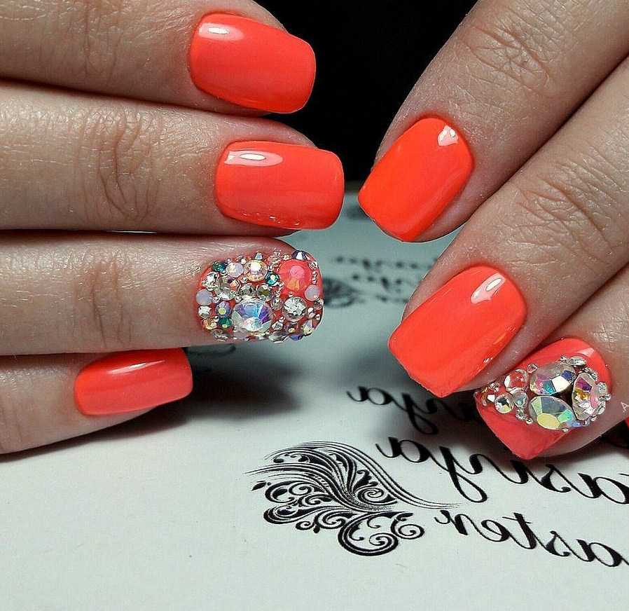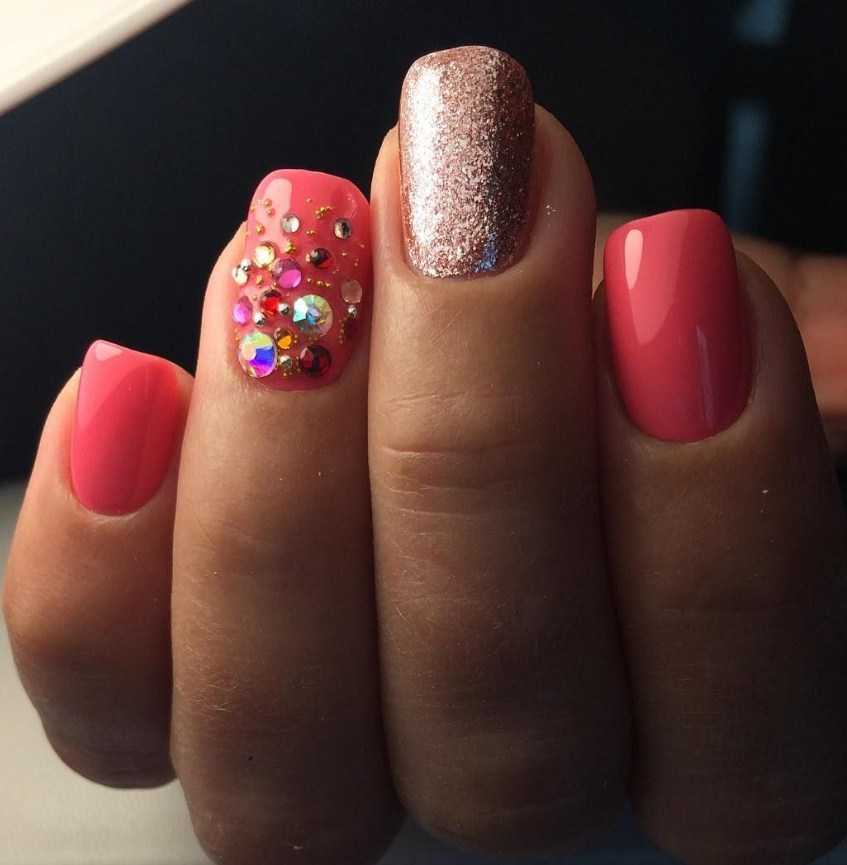 Сияющие покрытия красивы в любом цветовом варианте, и коралл – не исключение. Самый простой способ сделать маникюр роскошным и гламурным – добавить россыпь стразов или выложить ими рисунок. В моде сегодня и мелкие блёстки на светлом или тёмном фоне – шиммер, втирка, а также крупные пайетки и камифубуки.