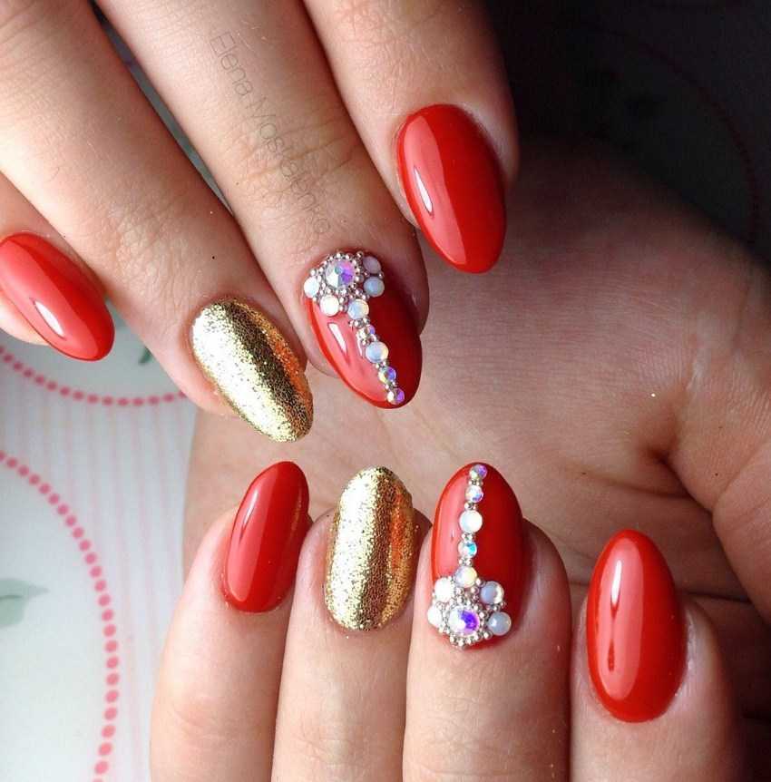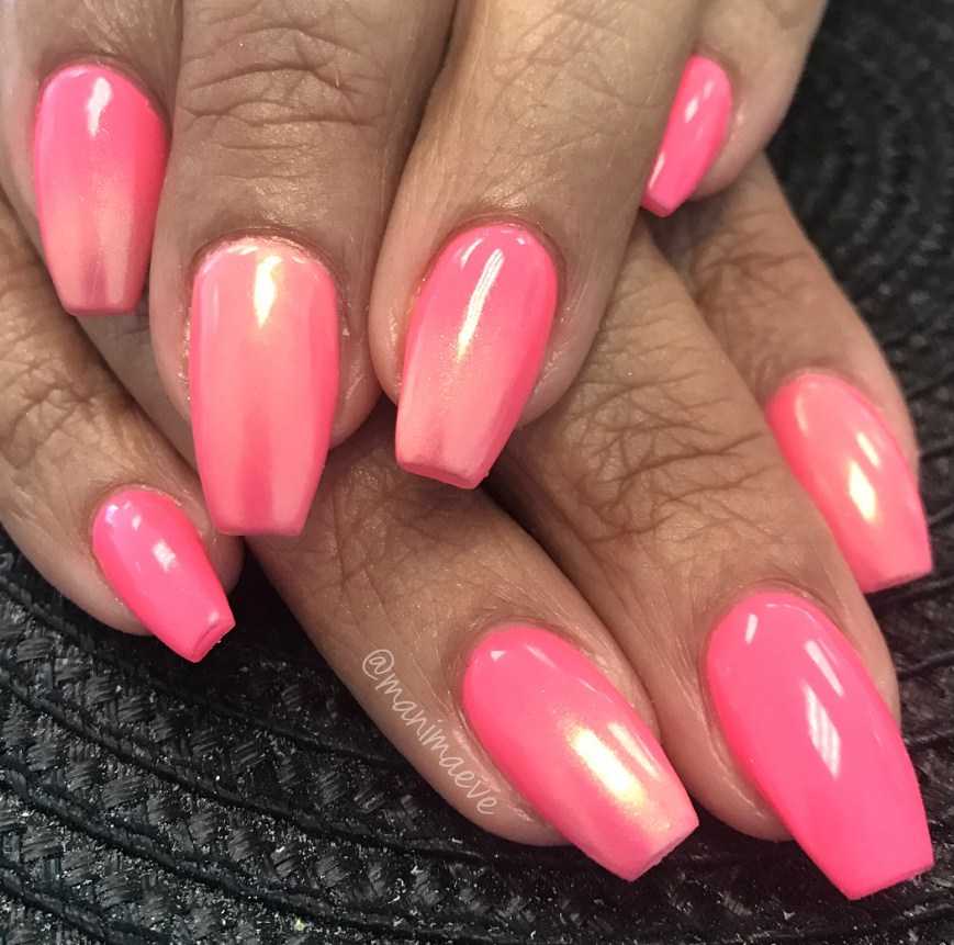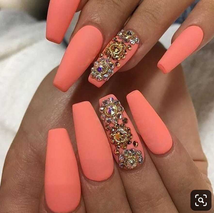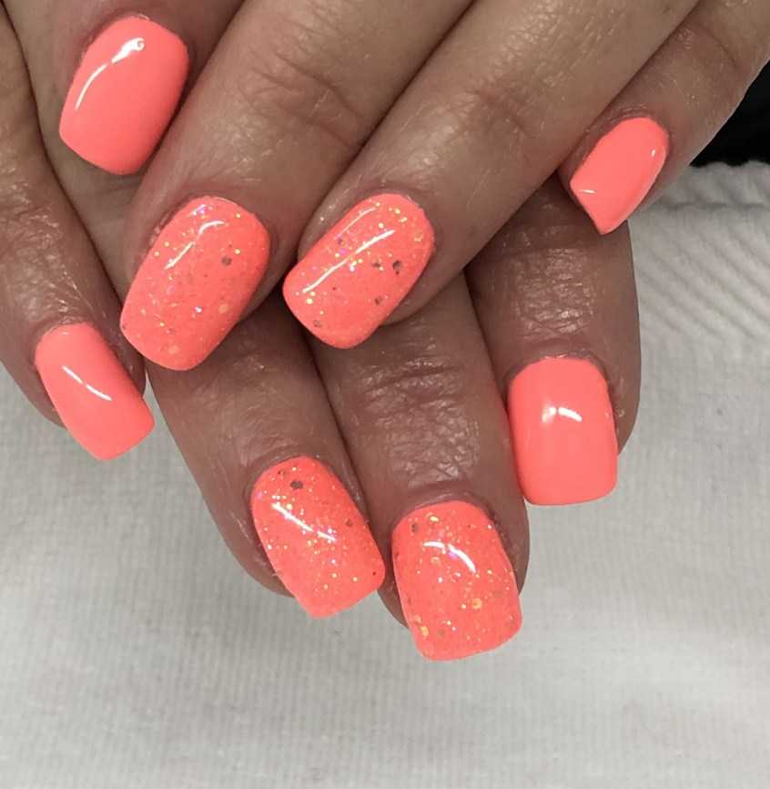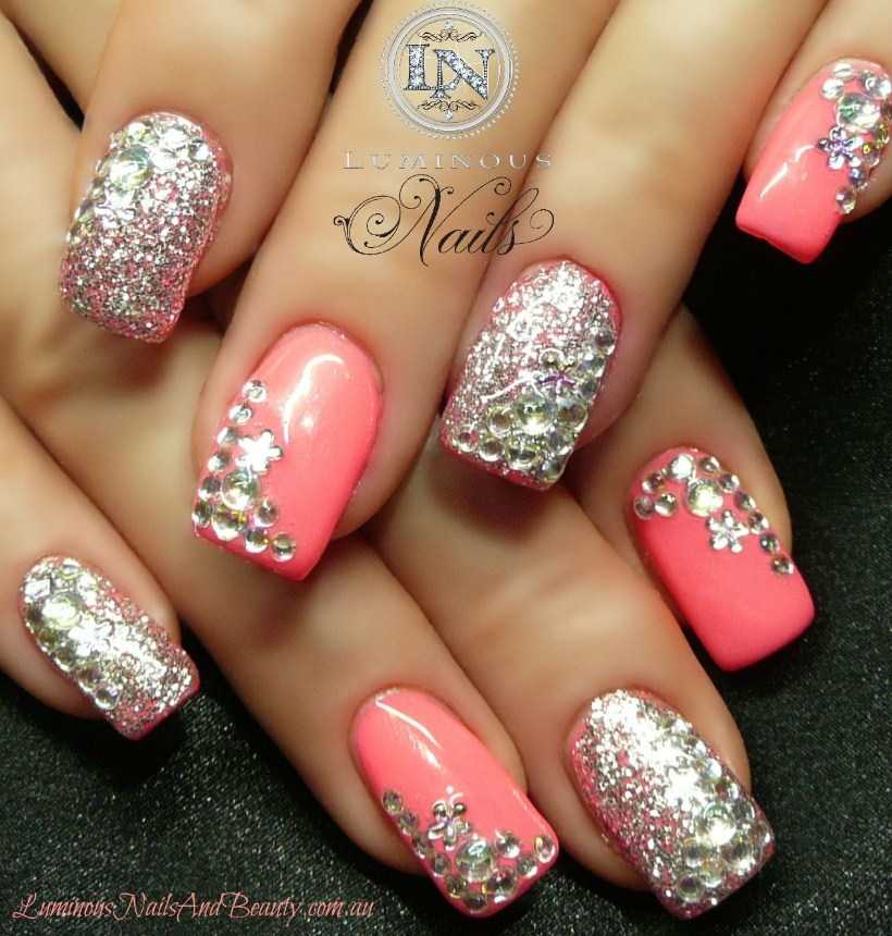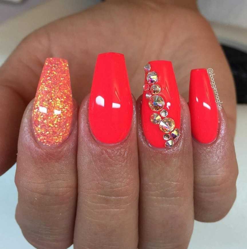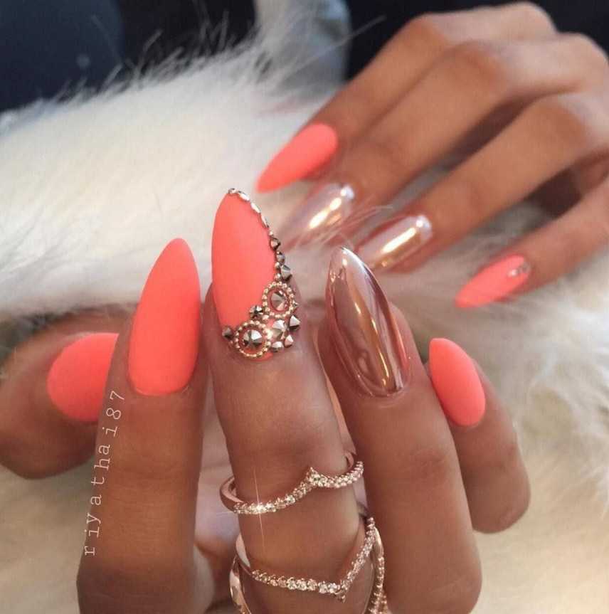 Сияющие покрытия красивы в любом цветовом варианте, и коралл – не исключение. Самый простой способ сделать маникюр роскошным и гламурным – добавить россыпь стразов или выложить ими рисунок. В моде сегодня и мелкие блёстки на светлом или тёмном фоне – шиммер, втирка, а также крупные пайетки и камифубуки.