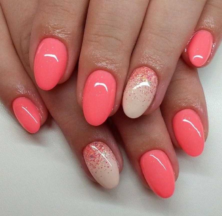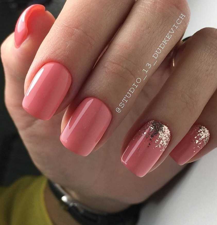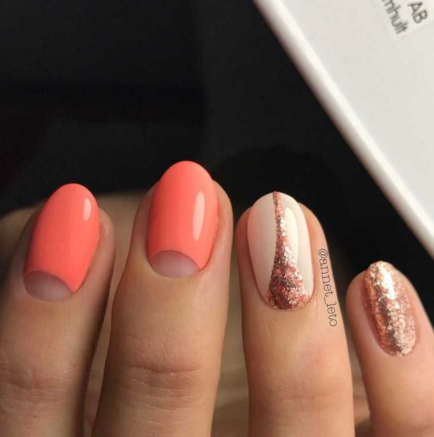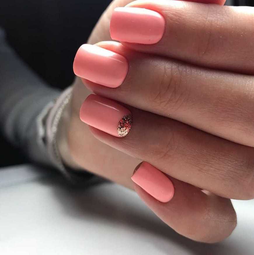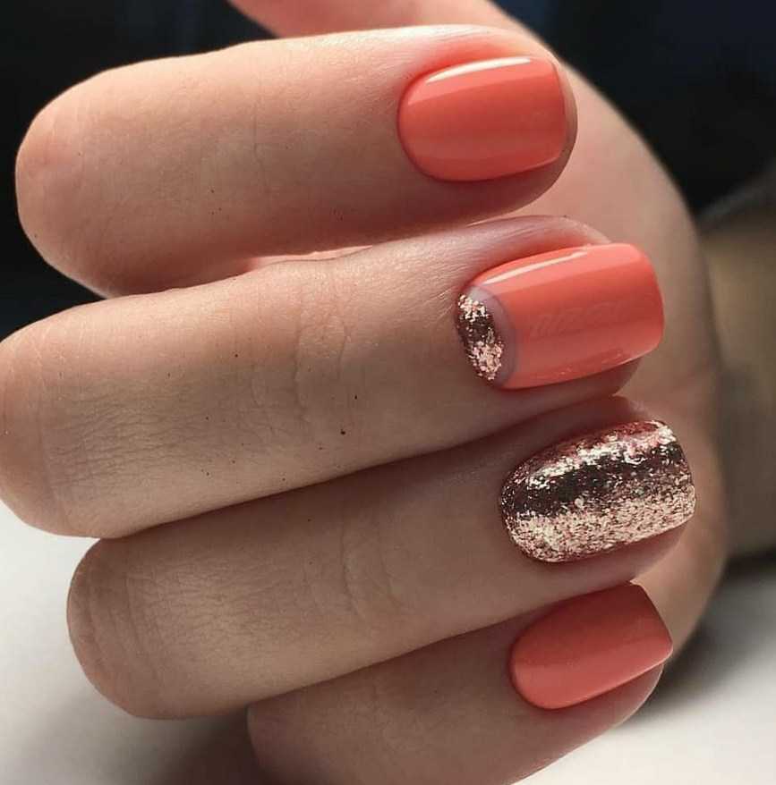 Лучше использовать втирку не на всех ноготках, чтобы не затмевать красоту основного тона-коралла.