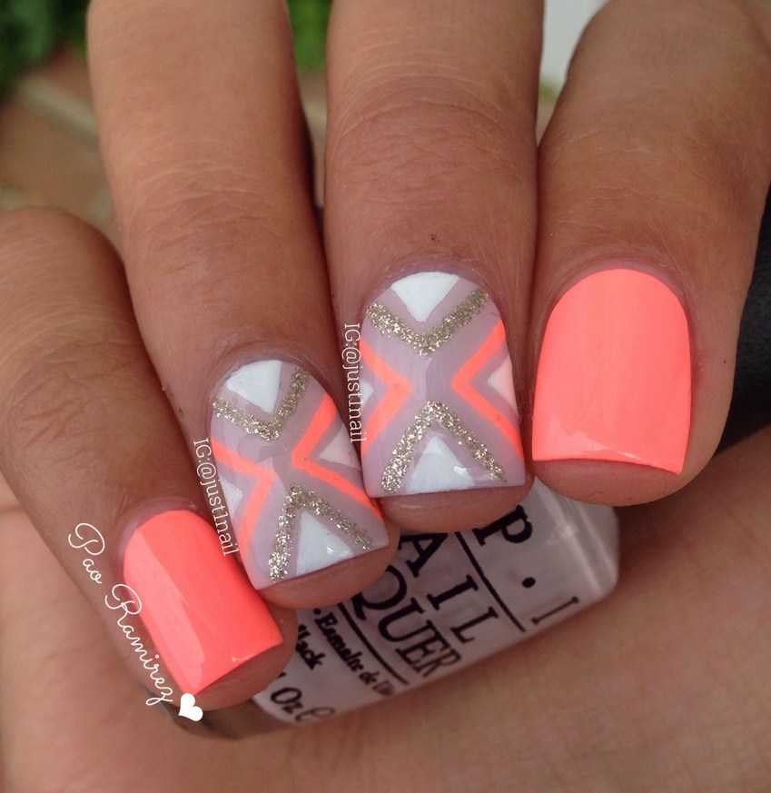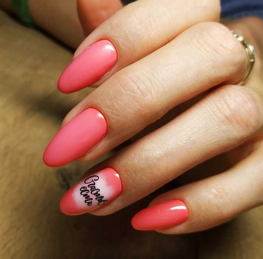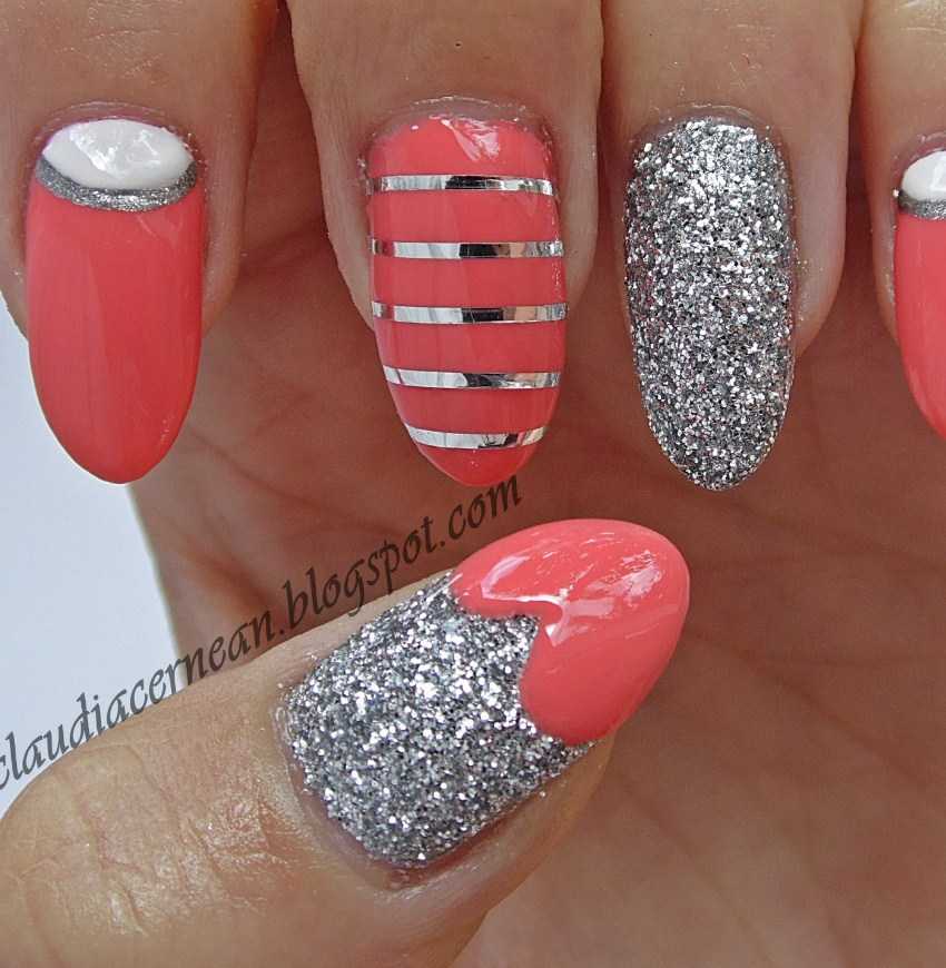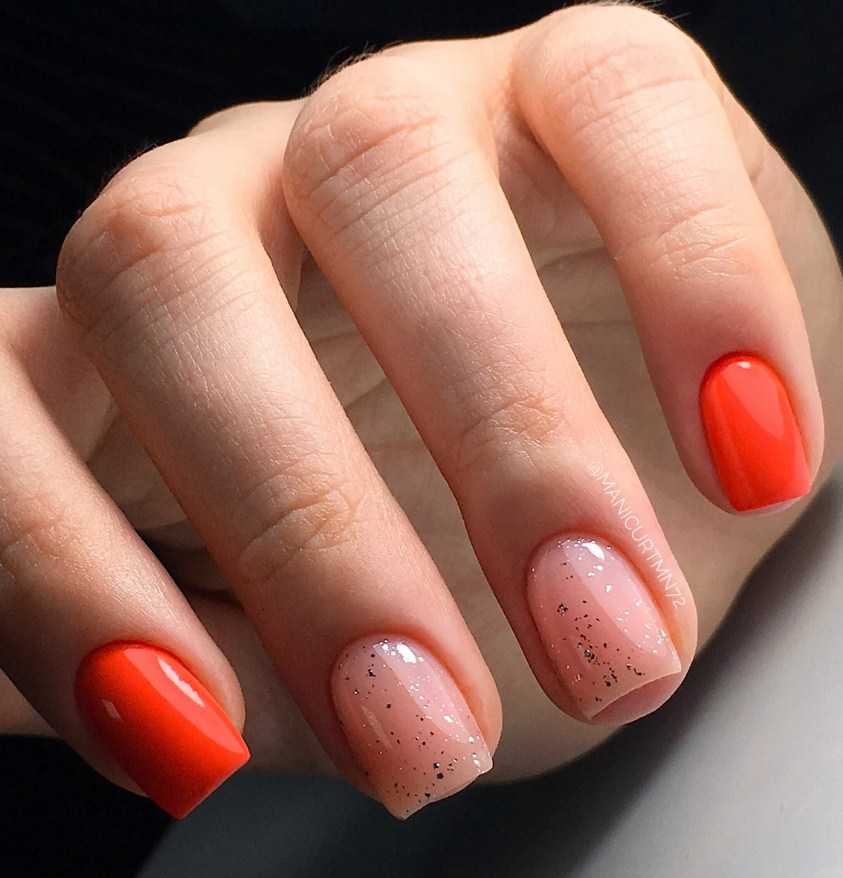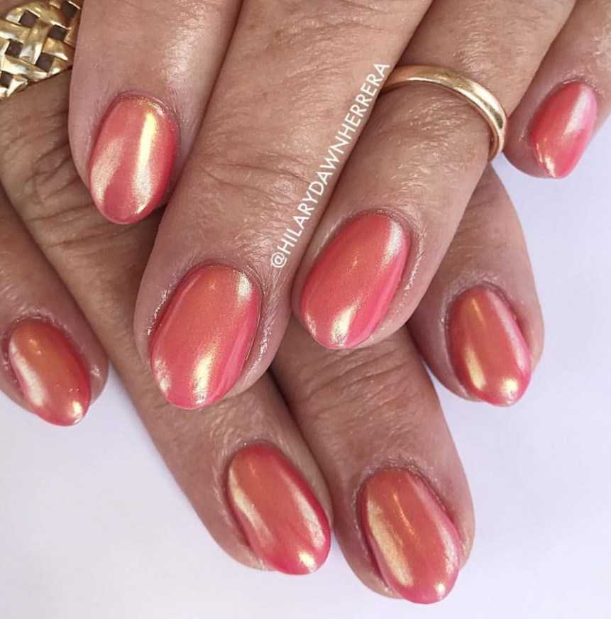 Лучше использовать втирку не на всех ноготках, чтобы не затмевать красоту основного тона-коралла.