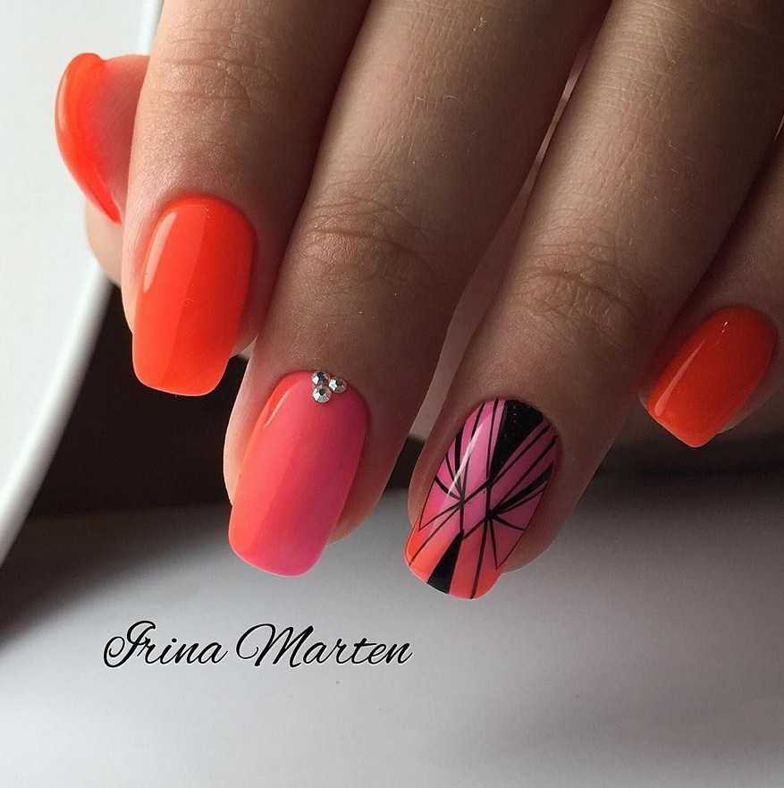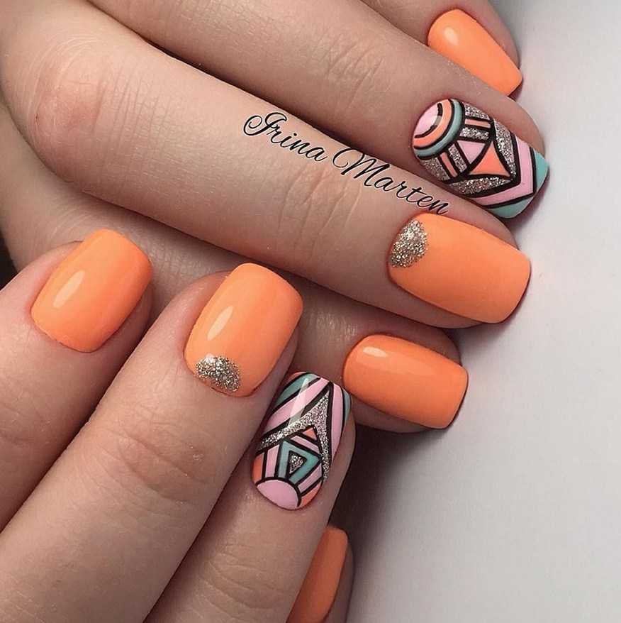 Геометрия – трендовый дизайн в маникюрном искусстве. Достаточно прорисовать простейшие кружки, полоски, точки, треугольники, линии, и ногти будут смотреться потрясающе. Для яркого, летнего образа лучше выбрать контрастную комбинацию тонов для дизайна-геометрии.