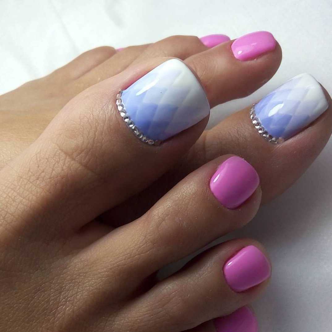 При создании такого маникюра и педикюра обычно используют 2 или 3 цвета, но можно увеличить количество до 6-8. Границы между цветами должны быть четкими. Красиво будут смотреться тандем френча и аэрографии. Можно дополнить дизайн стразами или узорами на нескольких ноготках. Эффектный вариант — сочетание омбре с пигментами и втиркой. Также невероятно шикарно смотрится союз с акриловой пудрой.