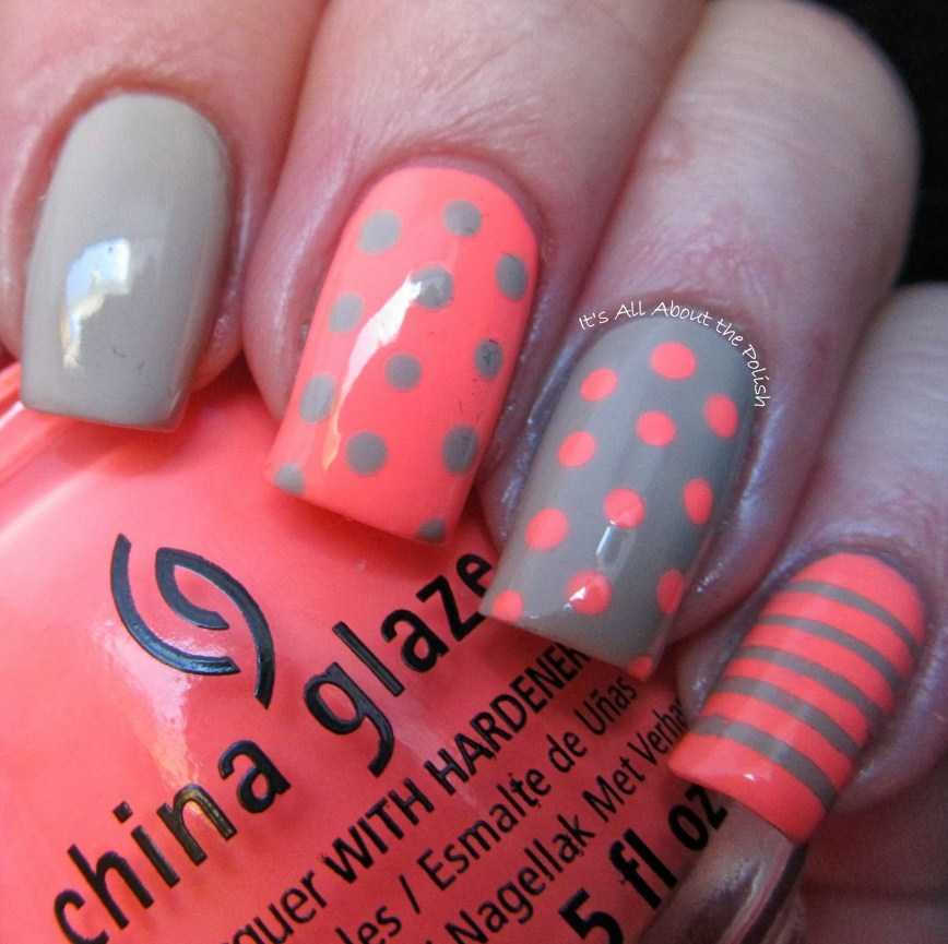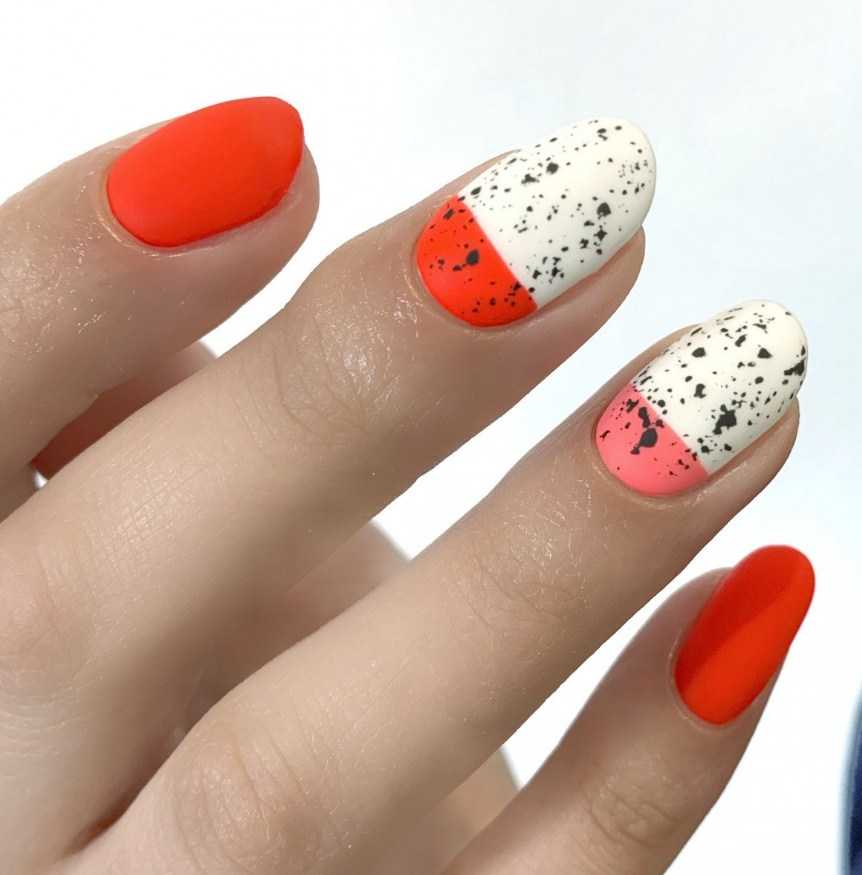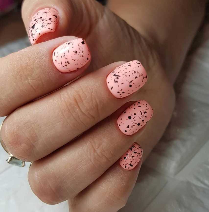Один из самых стильных, но простых в выполнении типов дизайна – это нейл-арт с крапинками, точками. Нанести его на однотонное покрытие сможет даже начинающий мастер. Цвет коралла шикарно сочетается с чёрным или тёмно-коричневым, и готовый дизайн будет напоминать перепелиное яйцо.