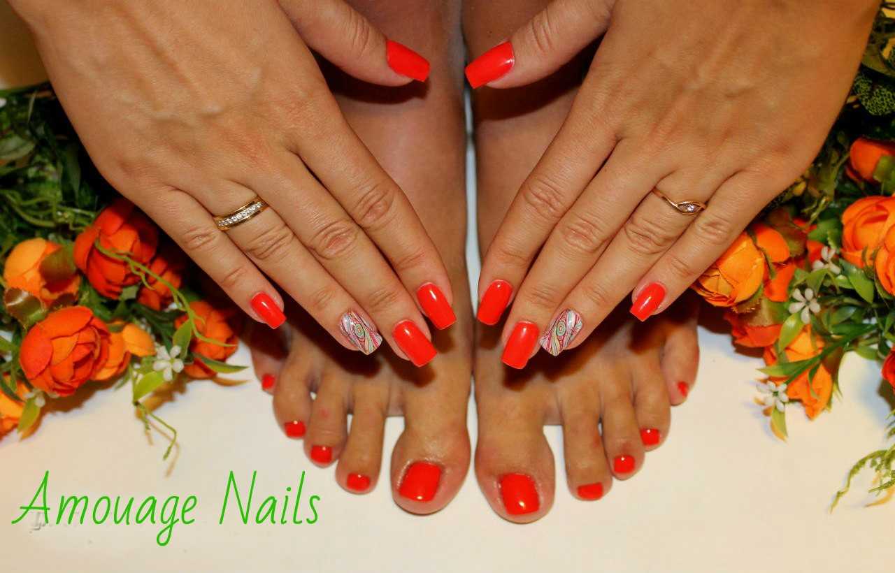 Глянцевый маникюр и педикюр в одном стиле для ярких девушек