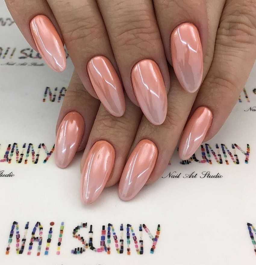 Форма “балерина” также требует особого подхода, как и острые ногти. Чтобы придать узору нежный и женственный вид, накрасьте ногти светлыми лаками из розовой и персиковой палитры или вовсе прозрачными. Жемчужный дизайн на ногтях с восковым лаком также будет выглядеть красиво, как на фото ниже (см. здесь другой пример маникюра с восковым лаком, который подойдет для ногтей балерины). Если вам нравится более замысловатый вид, украсьте ногти миниатюрными стразами или бисером.