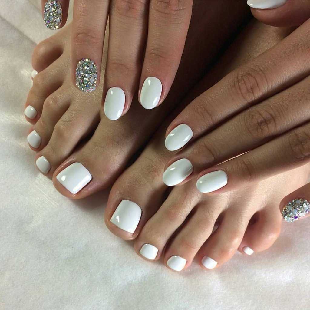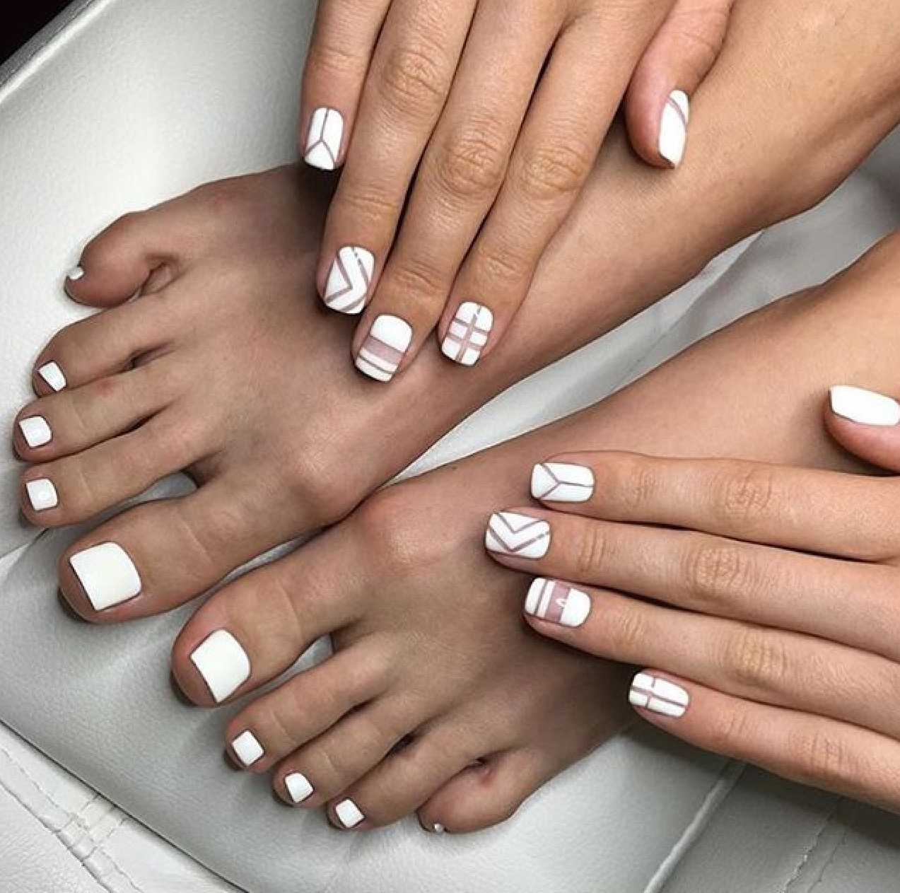 Что касается сочетания белого маникюра с педикюром, то тут стоит придерживаться тех же правил, что и с любым другим цветом – единым должен быть только оттенок, а дизайн отличаться.