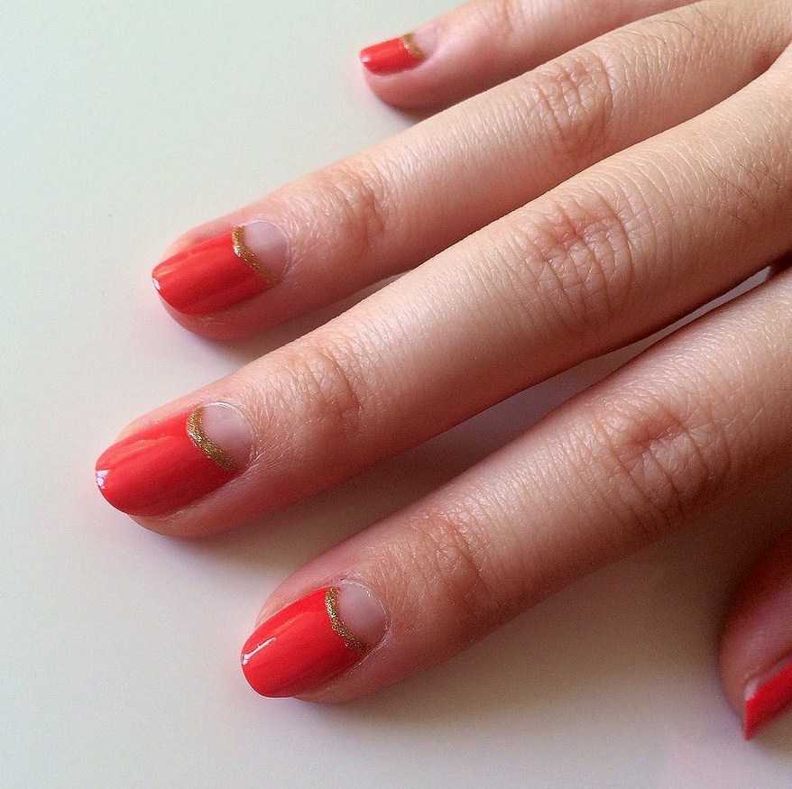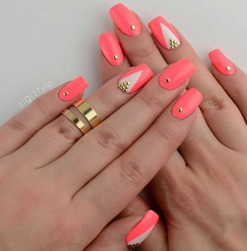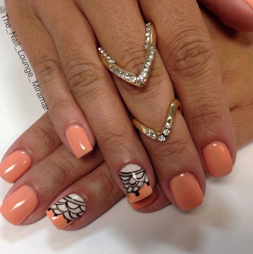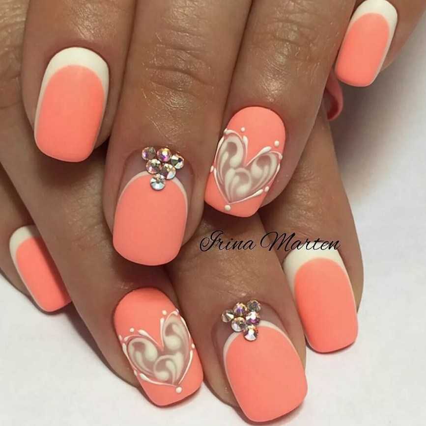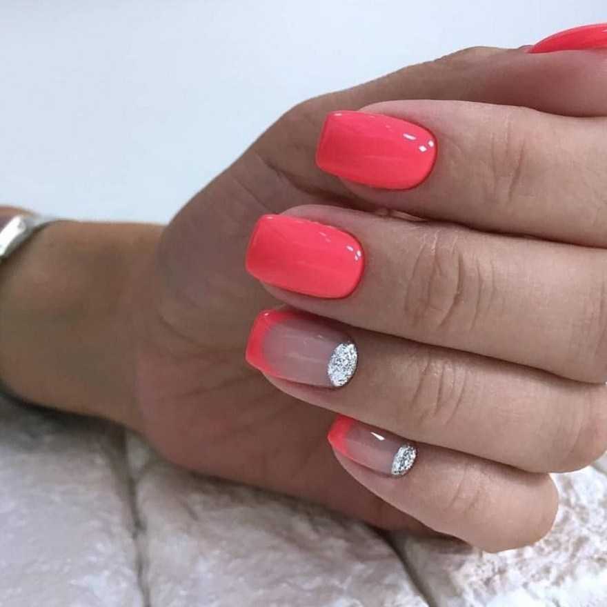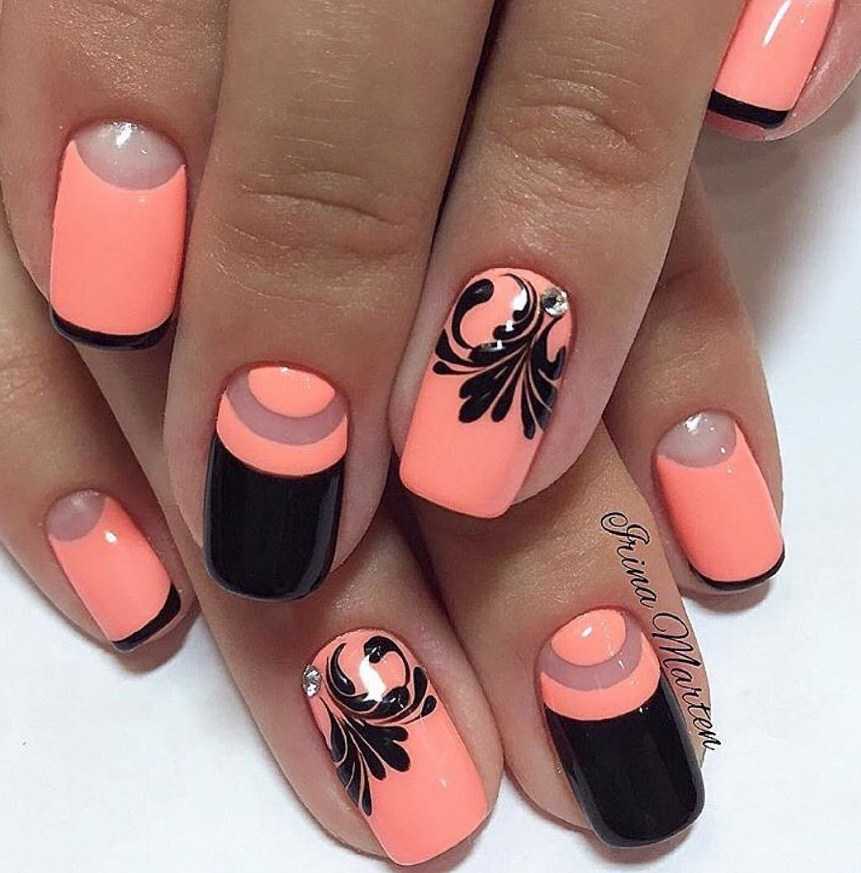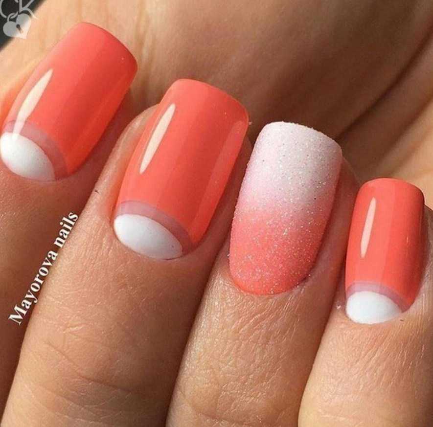 Френч и лунная техника – классические варианты маникюра, но совсем необязательно делать их в традиционных оттенках. Очень удачным решением будет прорисовка лунок оттенком коралла, либо оставление их прозрачными на общем розово-оранжевом фоне. Лунки могут быть обычными полукруглыми, арочными, треугольными и даже квадратными – как подскажет фантазия.