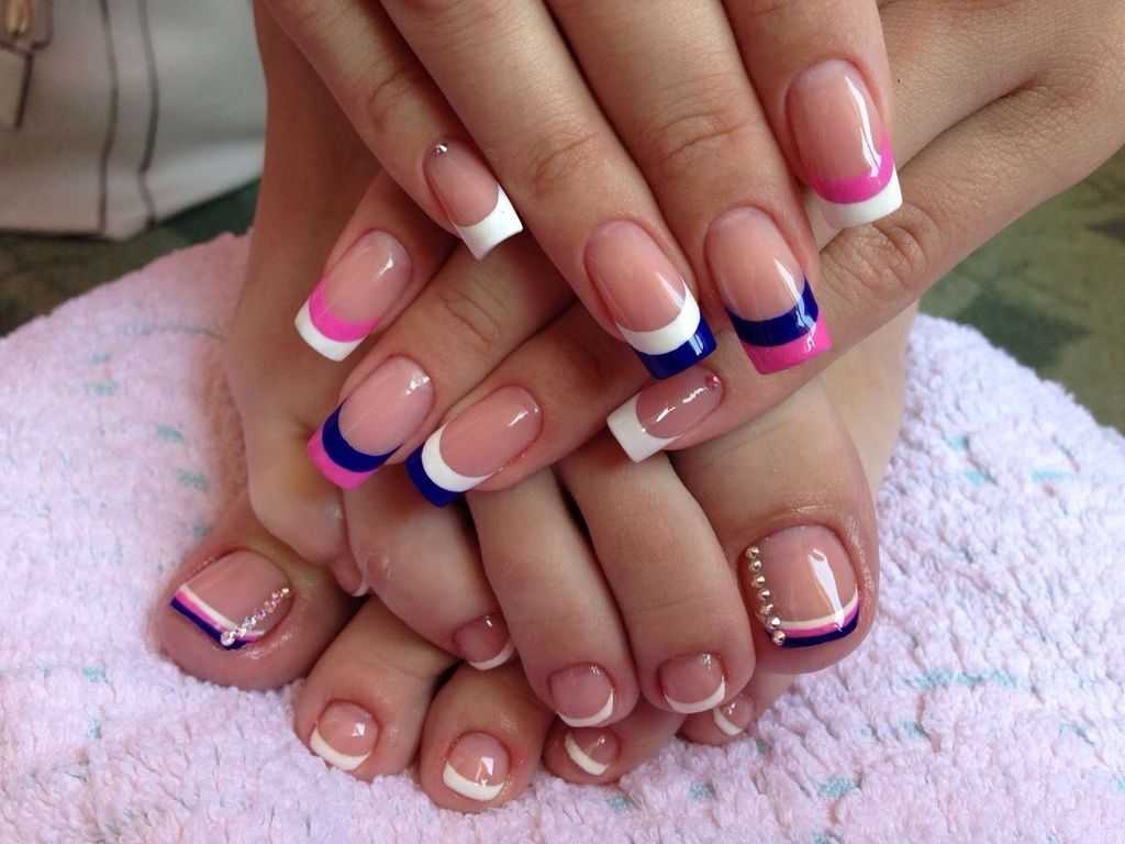 Если такой дизайн кажется вам слишком банальным, то сделайте кончики на руках и ногах разным цветом. Замените стандартные белые края на разноцветные: красный, синий, розовый, фиолетовый, зеленый. Интересно смотрится радужный френч, где в прорисовке «улыбки» участвуют сразу несколько ярких оттенков.
