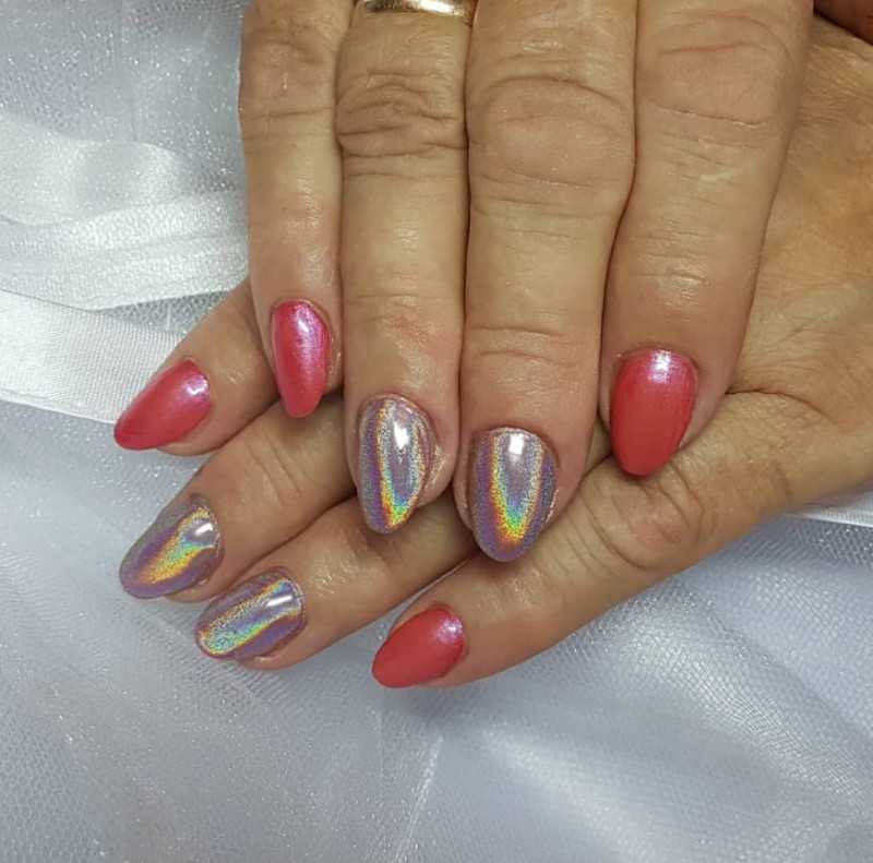 Голографическая, жемчужная, зеркальная втирка – отличное решение, позволяющее сделать маникюр королевским.