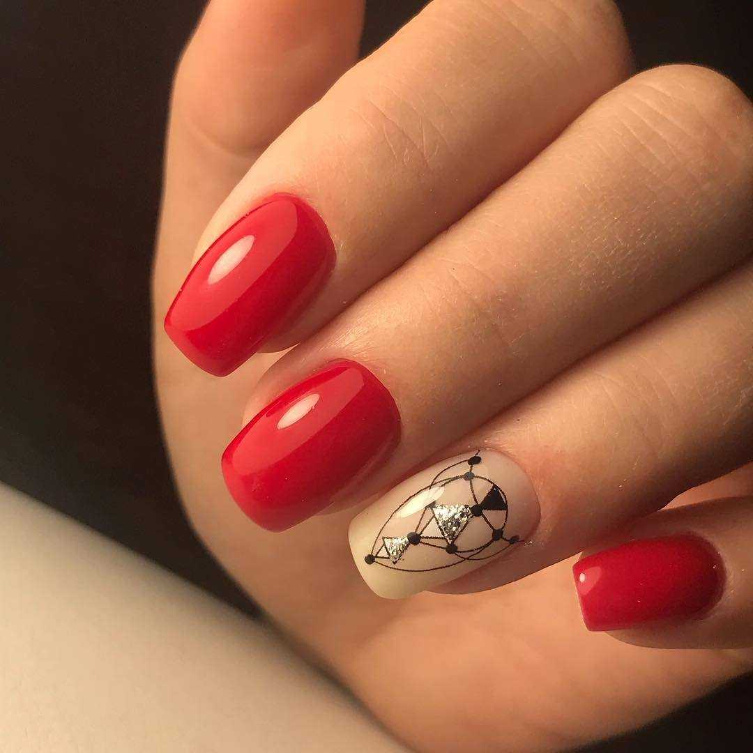 Один из самых горячих трендов в дизайне маникюра можно смело использовать с красным цветом. Сегодня в моде геометрический нейл-арт в любом проявлении: начиная от лаконичных линий и паутинок заканчивая сложными объемными конструкциями. Если хочется чего-то простого, всегда можно ограничиться лаконичной клеткой или узором из ромбов. А еще, всегда актуальны абстракции, так что смотри следующий блок, чтобы почерпнуть идеи для сочетания других цветов цветов с красным.