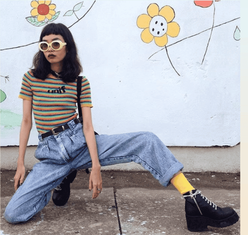 Особенностью стиля является популярность джинсовой одежды. Шиком было достать юбку, сарафан, комбинезон, штаны или даже костюм из денима. Дополняли образ джинсовыми головными уборами, сумками. Также отличительной чертой является стирание граней между мужским и женским гардеробом. В одежде женщины предпочитали мешковатые мужские брюки с растянутыми майками или свитерами.