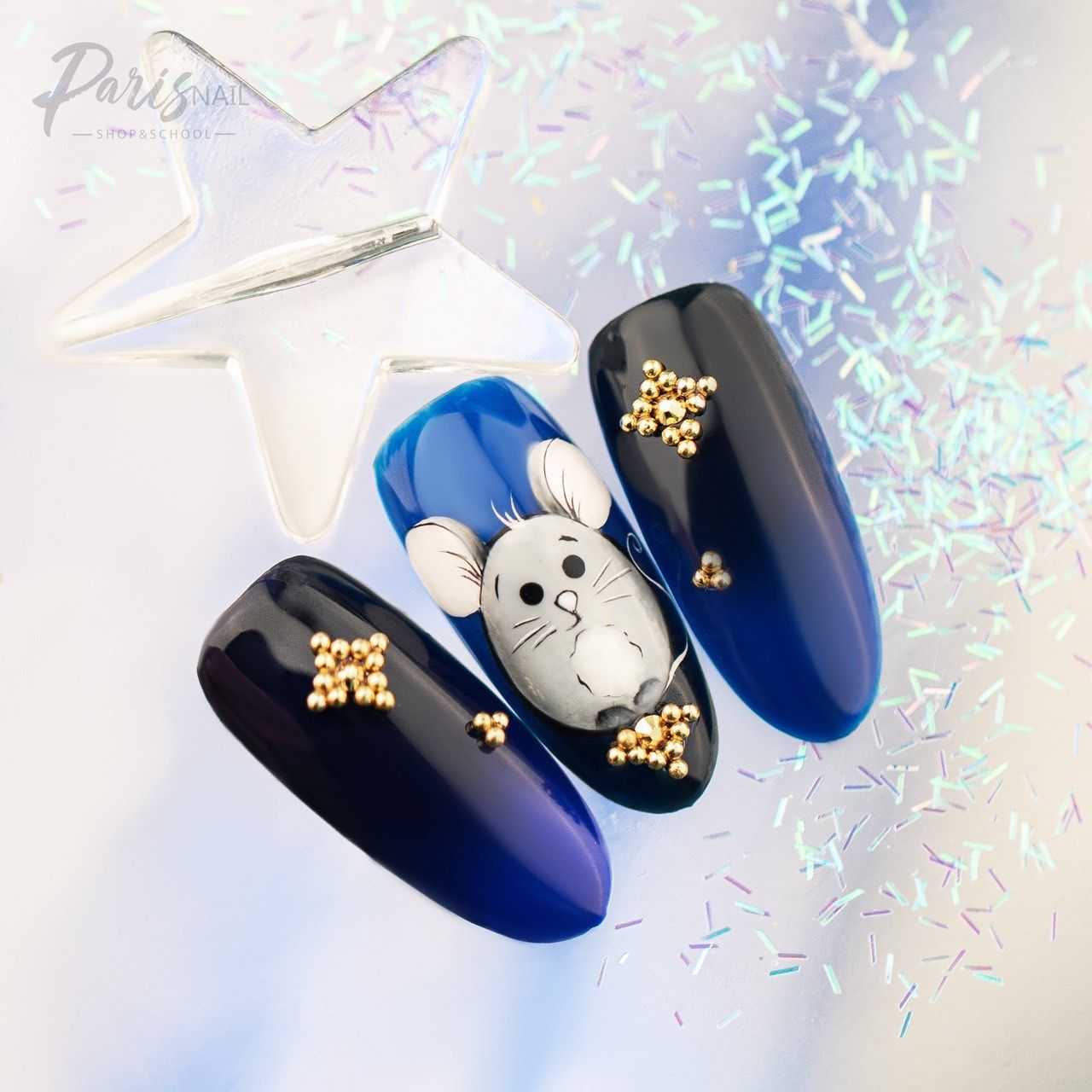 Любые рисунки всегда можно красиво обыграть дополнительными деталями и для нашего изображения с мышкой идеальным дополнением станут небольшие кристаллы, стразы, бусинки, глиттер и другие элементы декорирования. Украшения могут непосредственно участвовать в оформлении рисунка, например, вместо нарисованных глаз и носика мышки можно прикрепить к ноготку бусинки или камушки. Также можно выложить таким способом всего зверька или прорисовать детали рисунка глиттером. Не менее шикарно смотрится «мышиные» портреты в технике лепка.