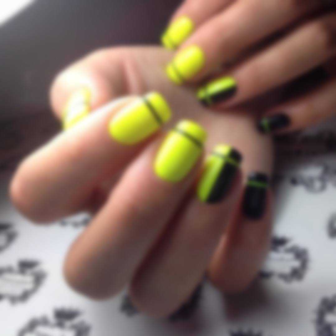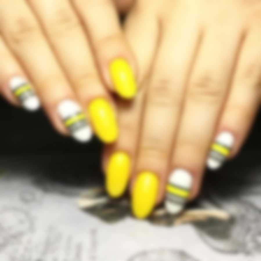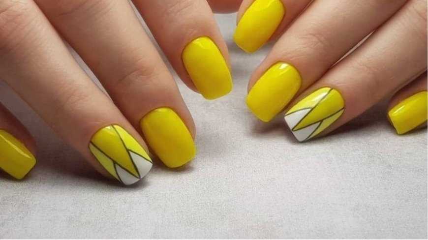 Геометрия. Желтый геометрический маникюр всегда пользуется спросом. Для такой техники лучше выбирать сочетание желтого и серого оттенков.