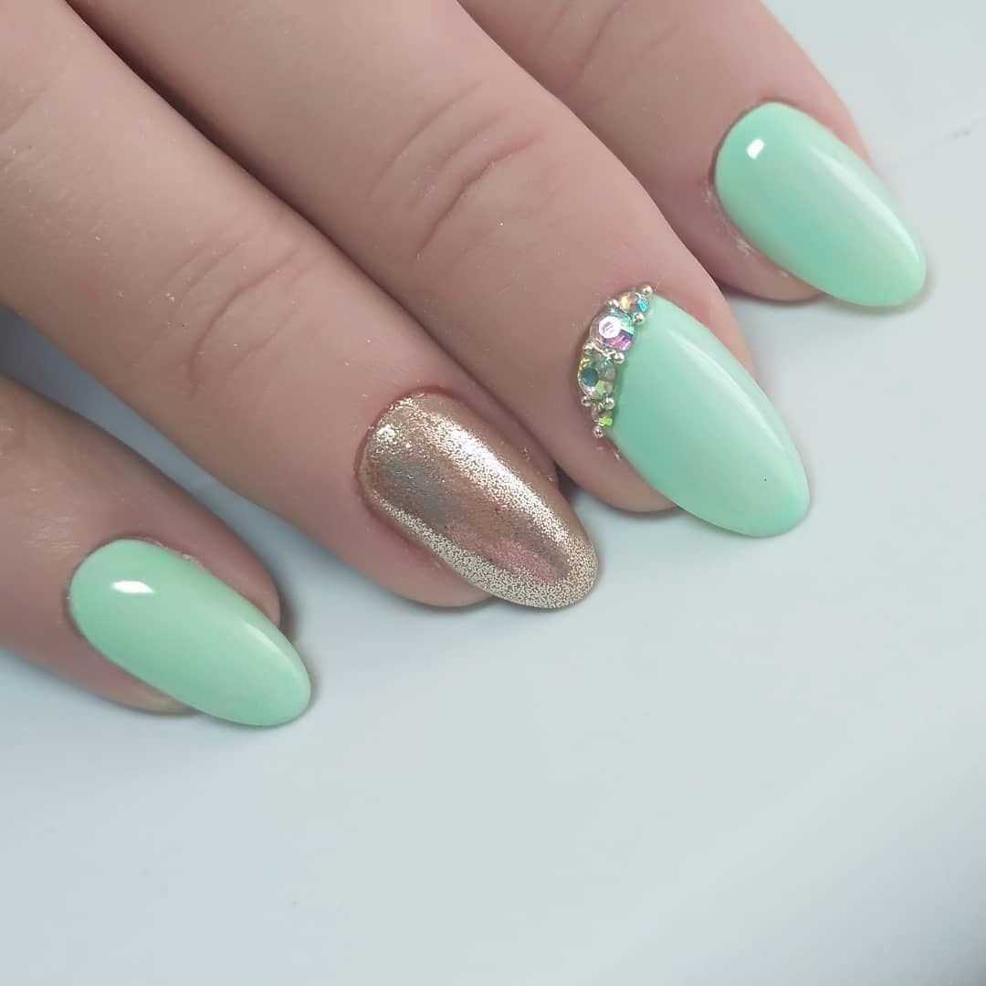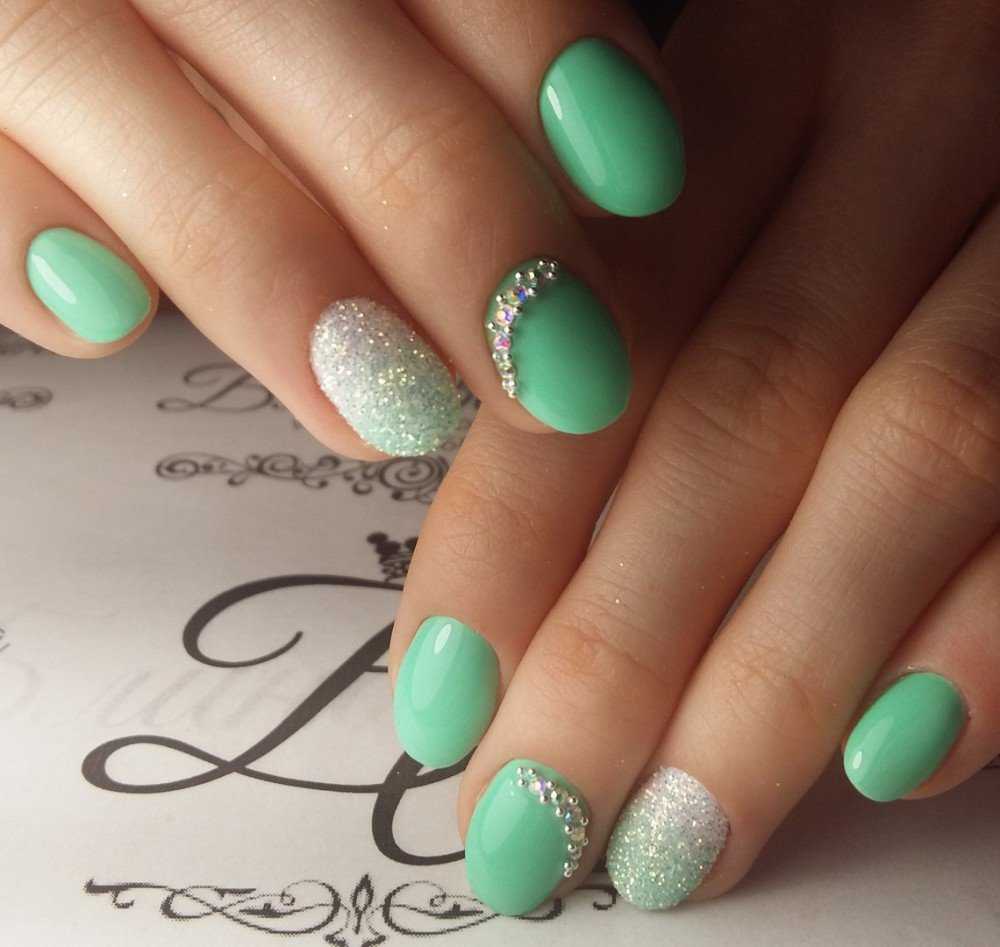 Как же обойтись без шика и блеска? Бывают случаи, когда нужно выглядеть особенно шикарно и броско. В этом случае попробуйте дополнить мятный маникюр сияющими стразами. Вариантов декора огромное количество. Стразами можно скромно украсить один из ногтей или выложить из них целую композицию. Но не забывайте основное правило при работе со стразами – используйте их в умеренном количестве. Изобилие блеска смотрится не просто вызывающе, а безвкусно. На фото вы можете посмотреть несколько хороших примеров красивого маникюра со стразами, выполненного в мятных тонах.