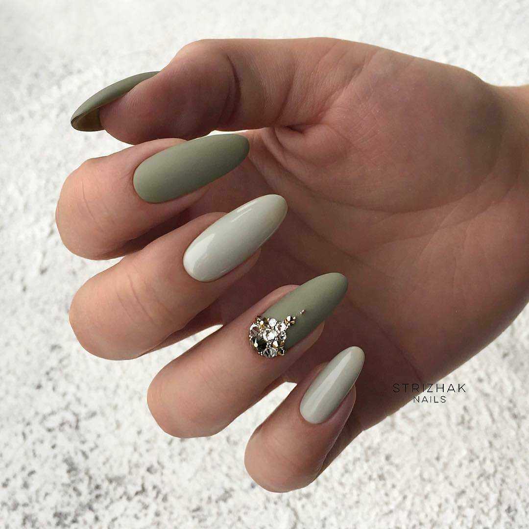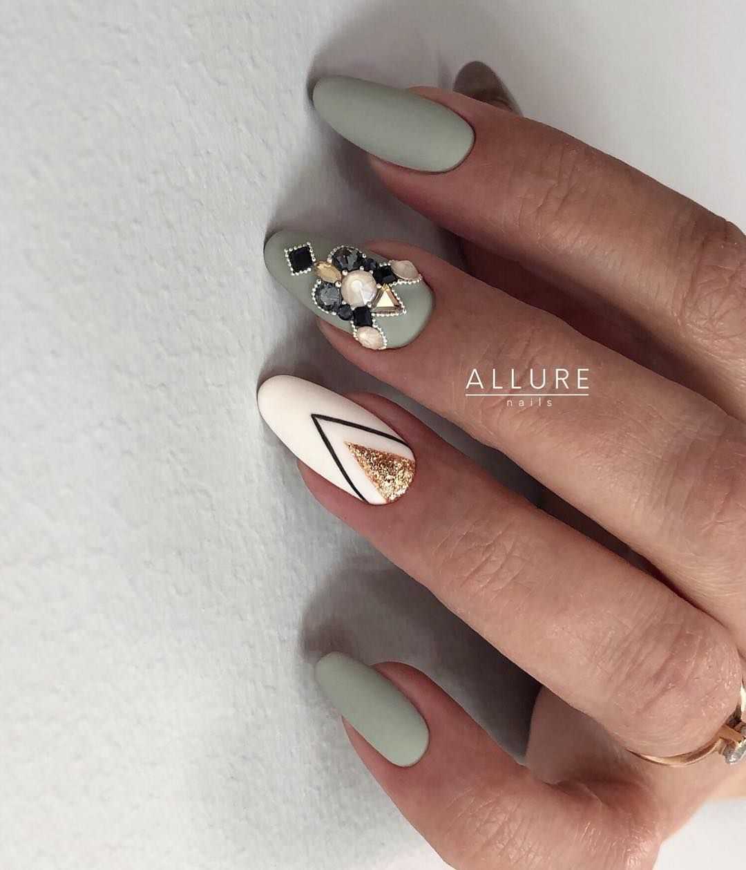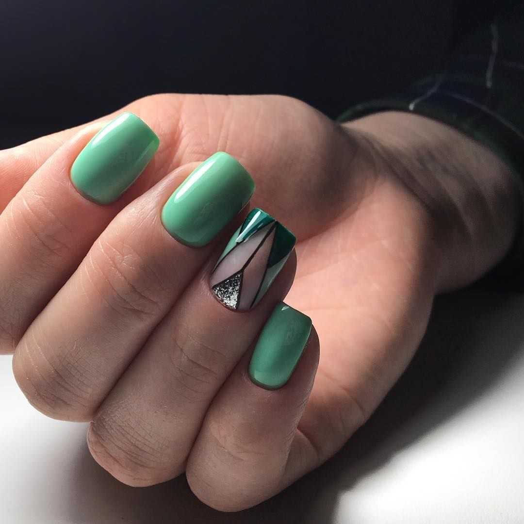 Матовый дизайн продолжает покорять сердца миллионов модниц. Глянец, несомненно, смотрится выразительно и красиво, но в бархатистом дизайне есть свое очарование. Матовый фисташковый маникюр – идеальное решения для делового и повседневного образа. Спокойный фисташковый просто нуждается в ярком дополнении, поэтому делайте дизайн со стразами, глиттером, песком и геометрическими фигурами.