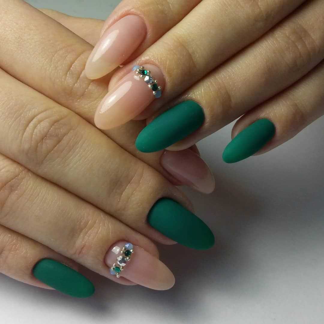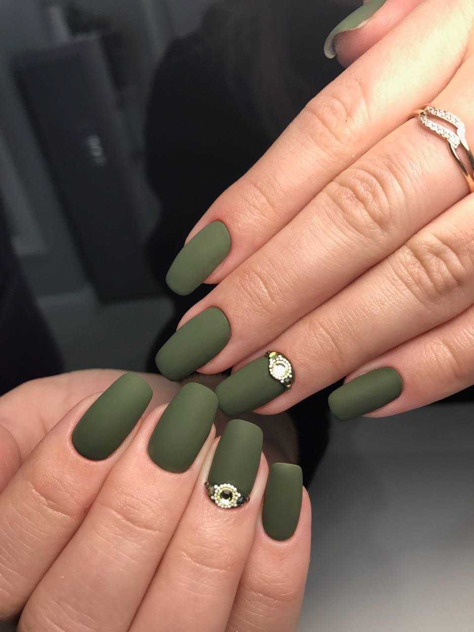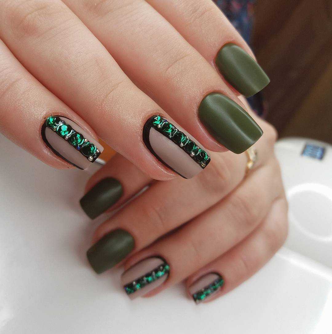 Матовый дизайн продолжает покорять сердца миллионов модниц. Глянец, несомненно, смотрится выразительно и красиво, но в бархатистом дизайне есть свое очарование. Матовый фисташковый маникюр – идеальное решения для делового и повседневного образа. Спокойный фисташковый просто нуждается в ярком дополнении, поэтому делайте дизайн со стразами, глиттером, песком и геометрическими фигурами.