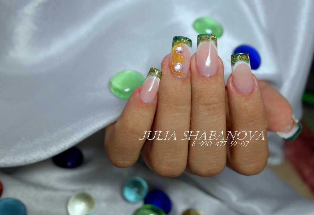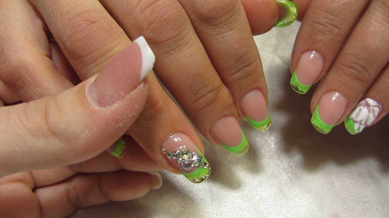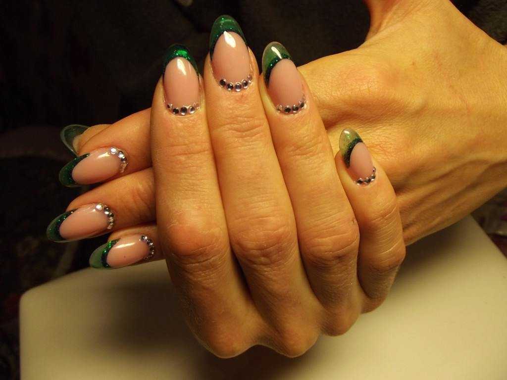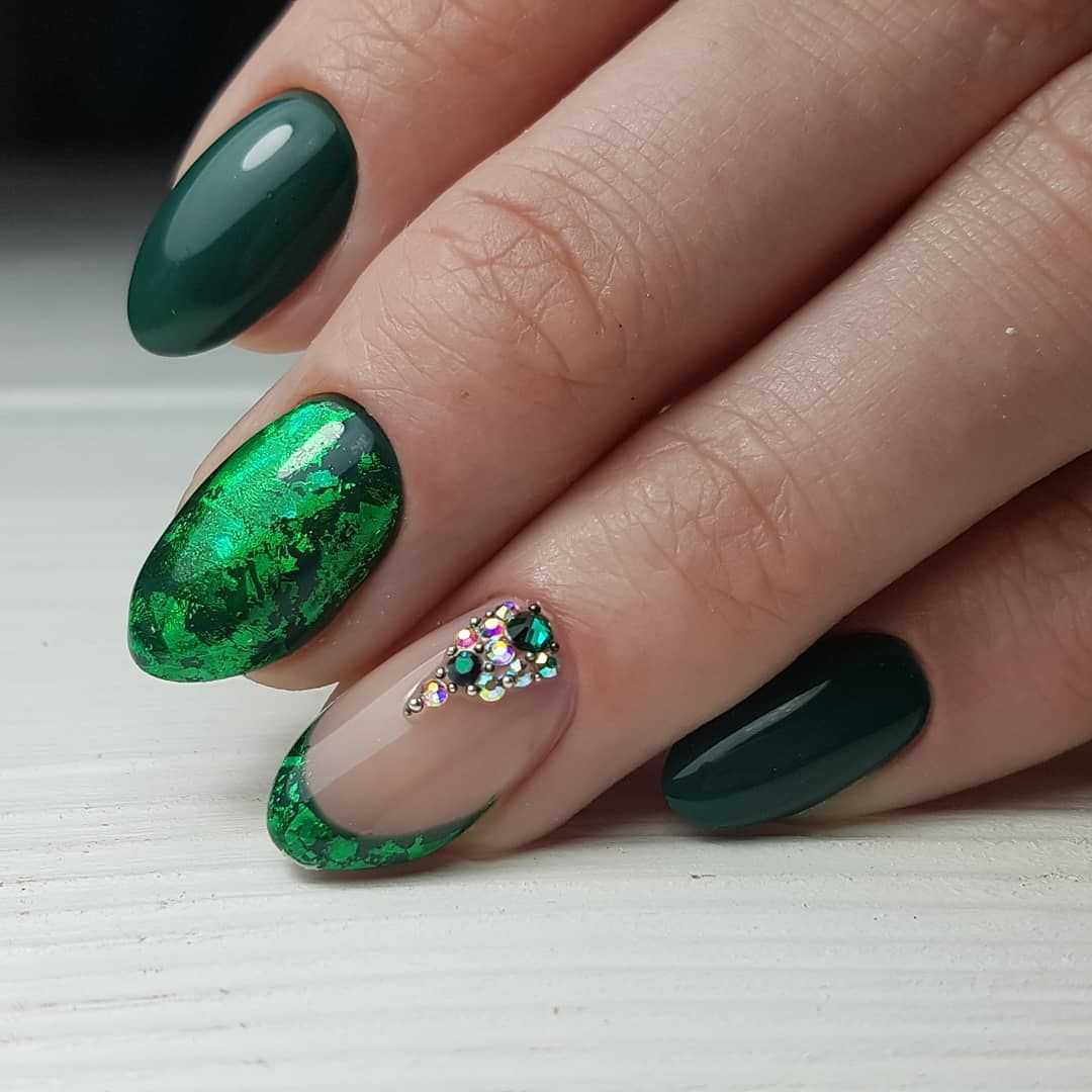 Чтобы сделать зелёный дизайн ногтей вечерним, добавьте на ноготь выкладку из страз. В сочетании с оттенками neon или салатовым камни смотрятся странно, но глубокие изумрудные или пастельные тона стильные кристаллы только преобразят.