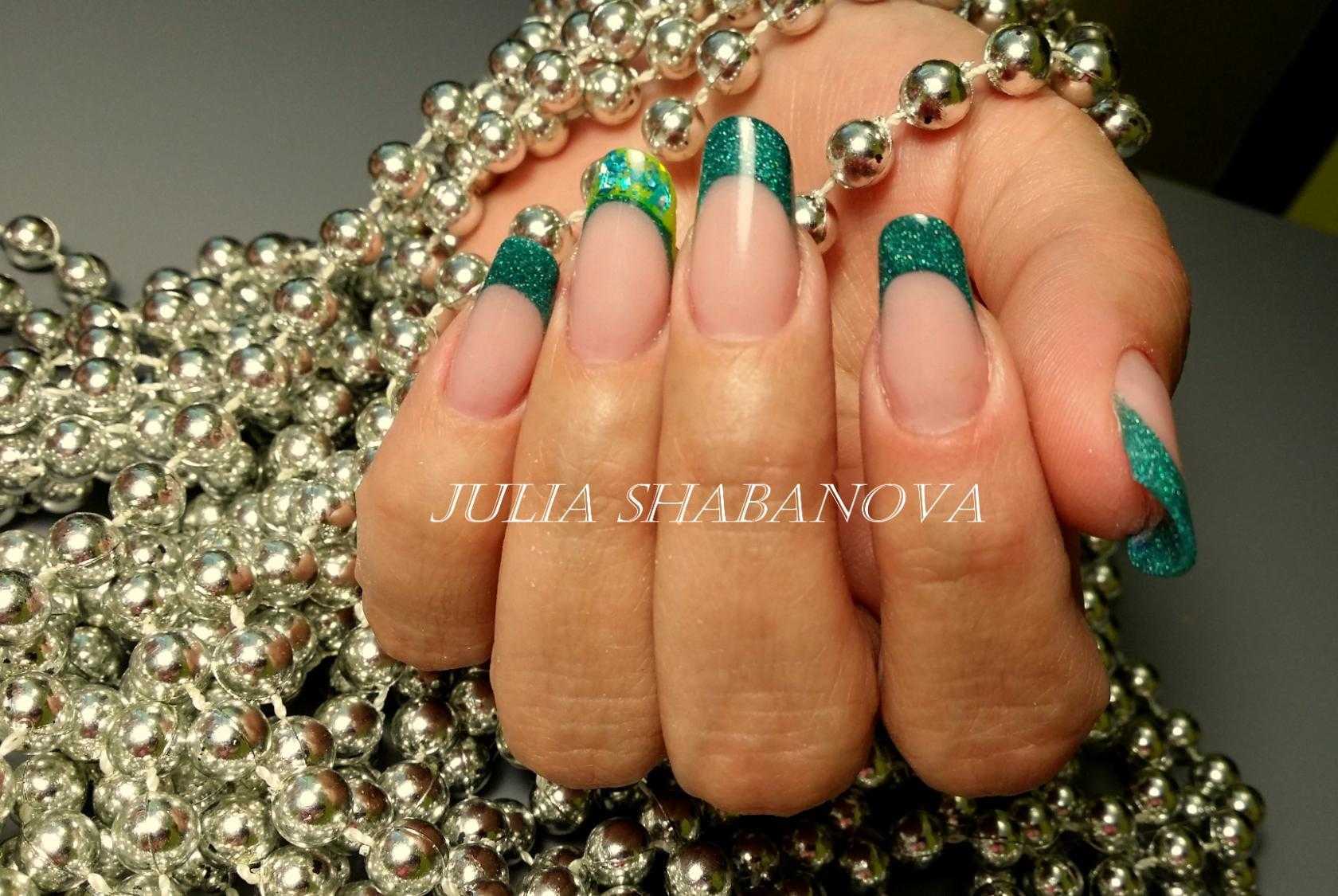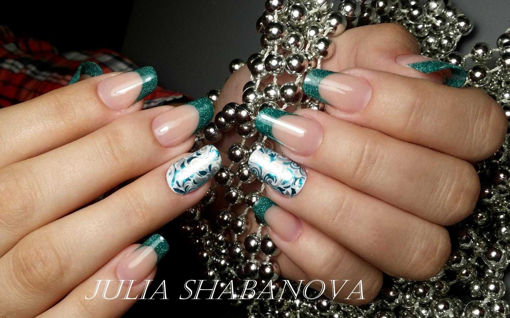Простая классическая техника выполнения французского маникюра уже немного наскучила современным модницам. Поэтому мастера решили пастельные и белые варианты отодвинуть на второй план. В силу вступают яркие цветовые палитры. Теперь они заставляют стильных модниц восхищаться новым дизайном френча. Невероятно оригинальная линия улыбки в изумрудном цвете стала самой востребованной. Украсить тонкую линию френча можно при помощи цветовых росписей или бульонками. Многие мастера предпочитают изумрудный французский маникюр выполнять мерцающим глиттером. Данный дизайн имеет оригинальный и богатый вид.