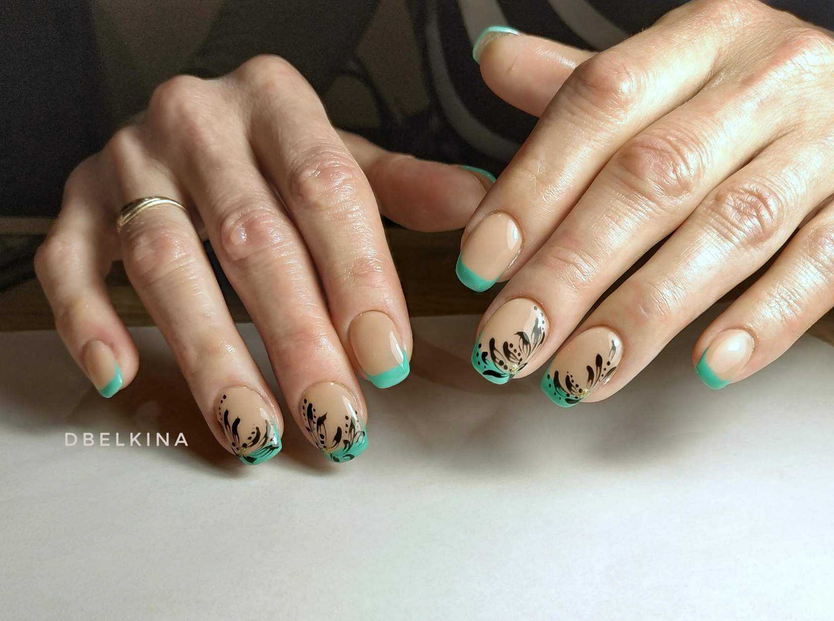 Бежевый — максимально нейтральный оттенок лака. Если дополнить такую базу изумрудным, мятным или хвойным — получится модный дизайн ногтей. Он освежит и придаст стиля образу.