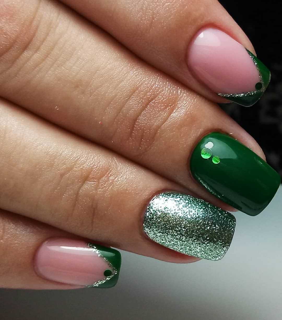Для повседневного дизайна используются традиционный френч и новые модные варианты лунного маникюра в стиле геометрия. Идеи на тему, как оформить маникюр в зеленых тонах, чтобы он смотрелся стильно и современно, ищите на фото.