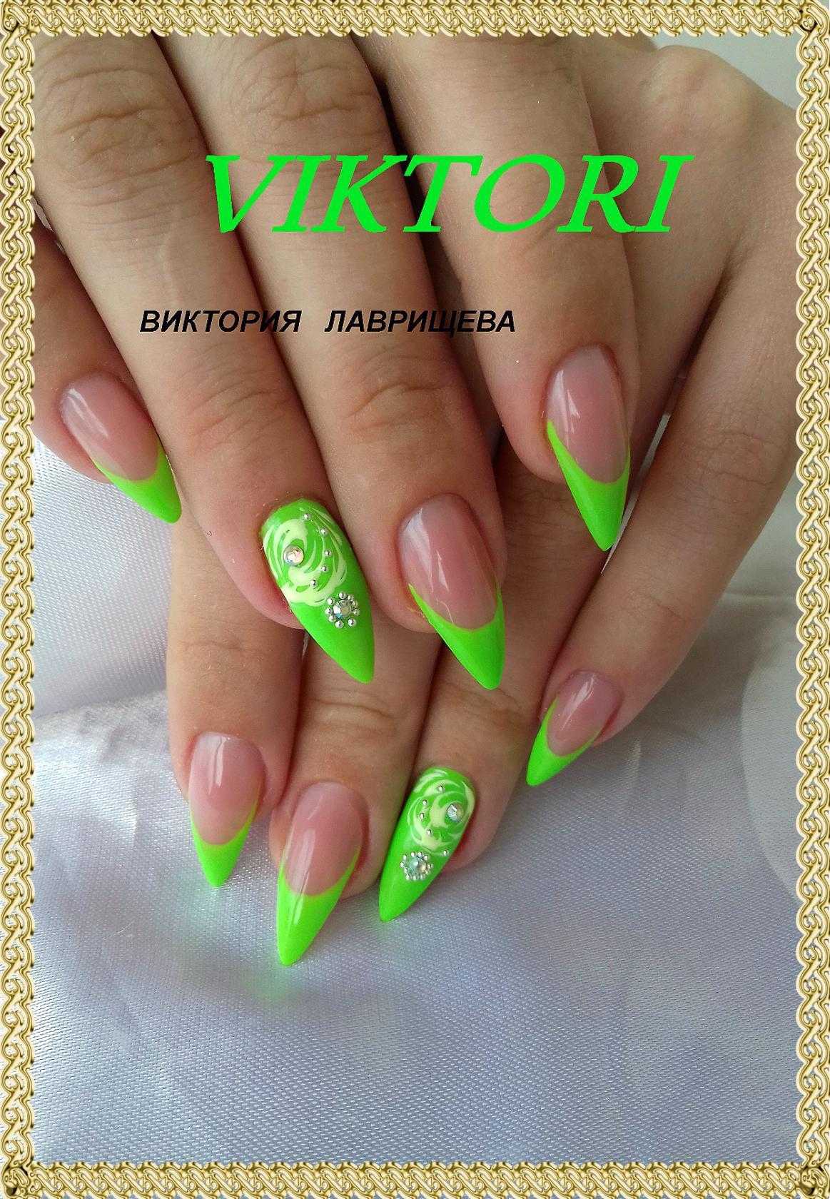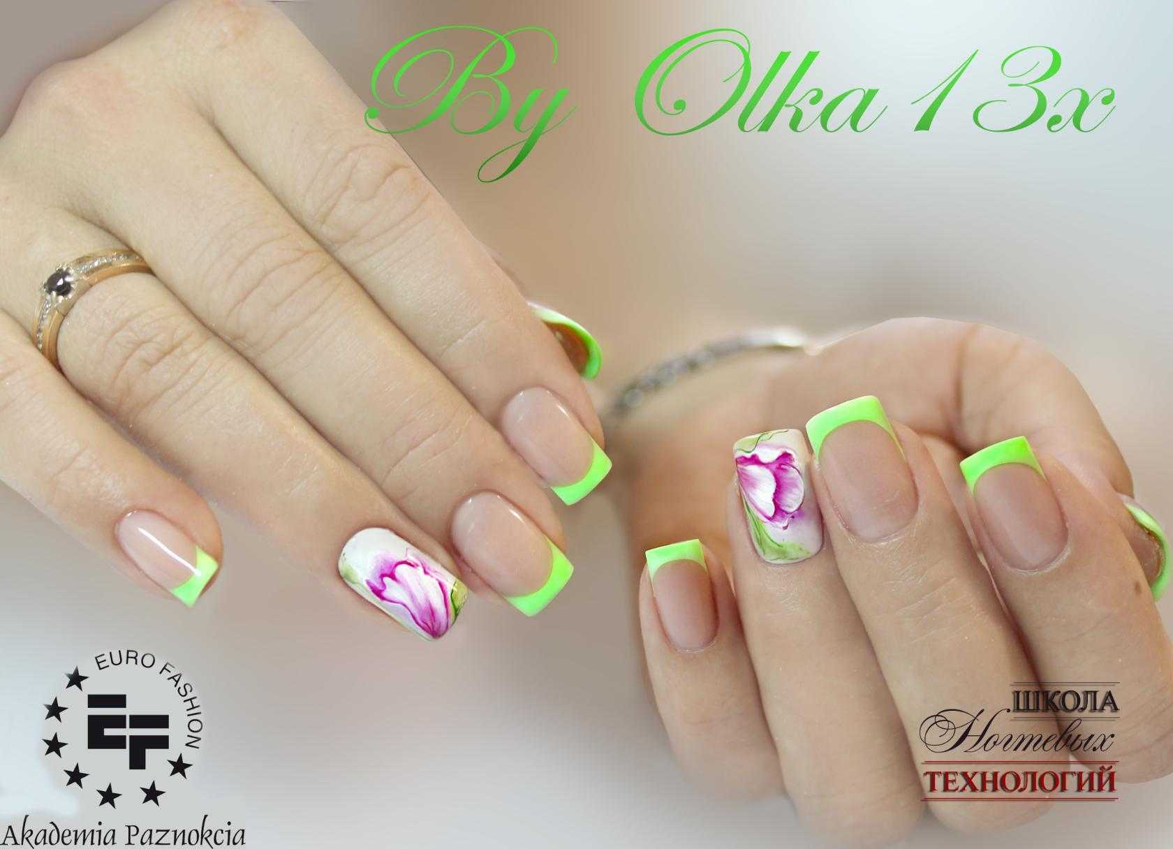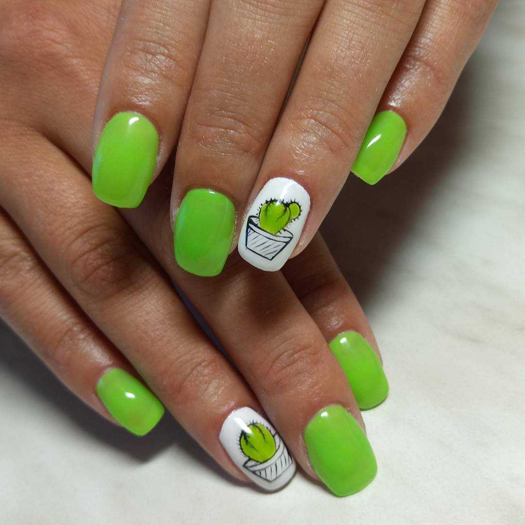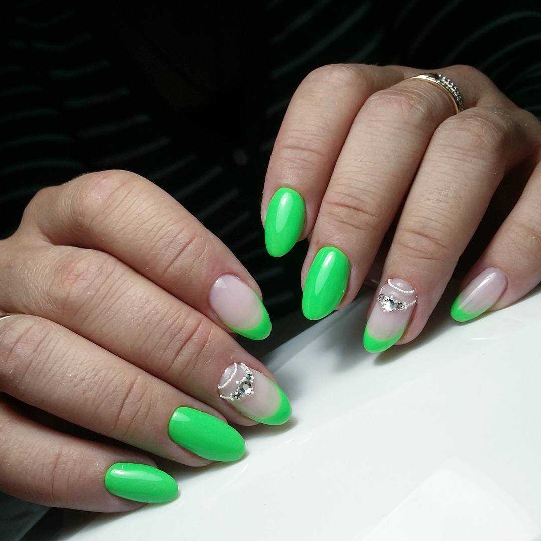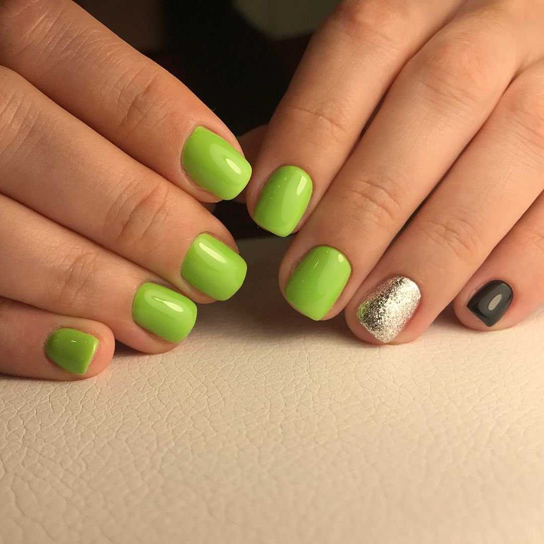 На фотографиях актуальные дизайны стильно смотрятся со всеми оттенками: от салатовых и неоновых до благородно-изумрудных. На лето особенно актуальны цвет молодой травы и нежный приглушённый ментол.