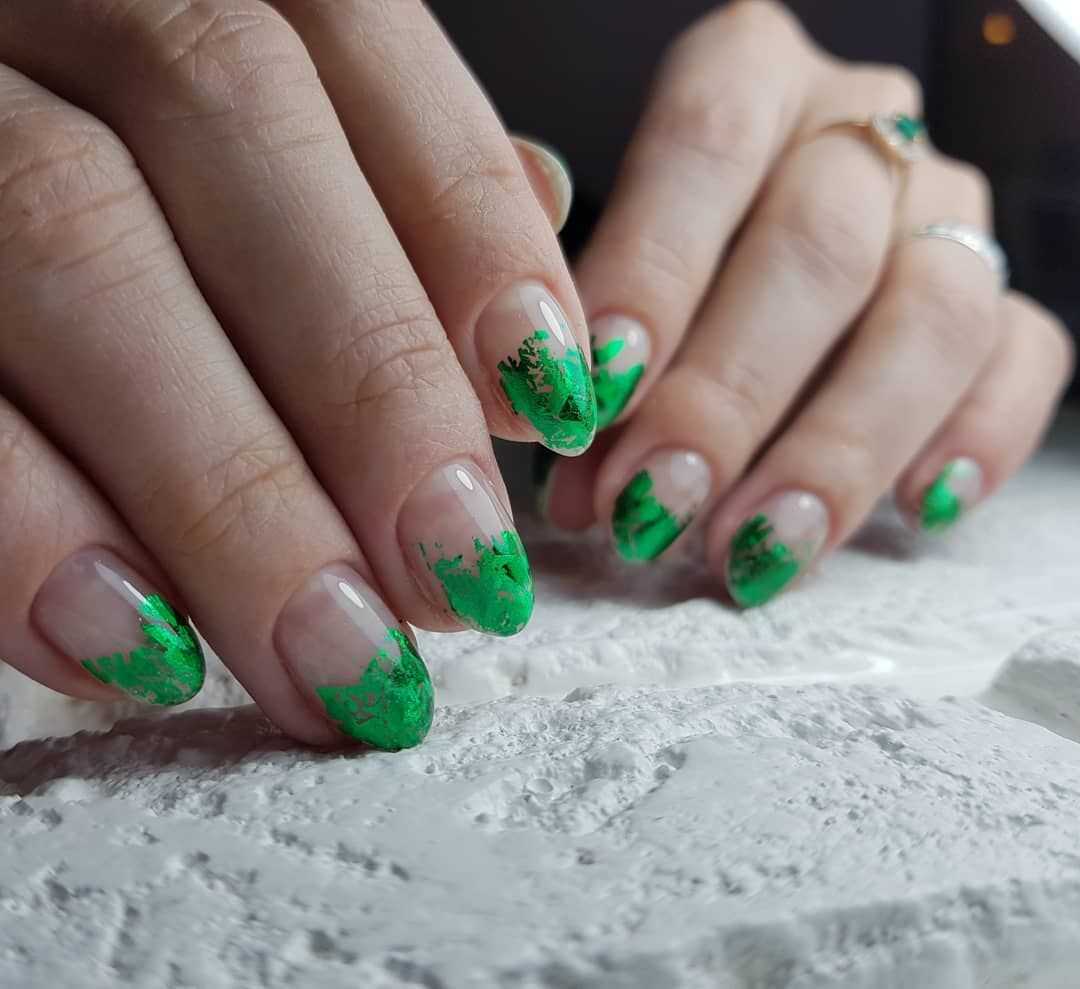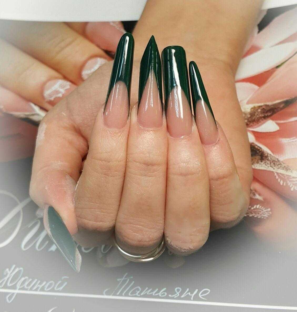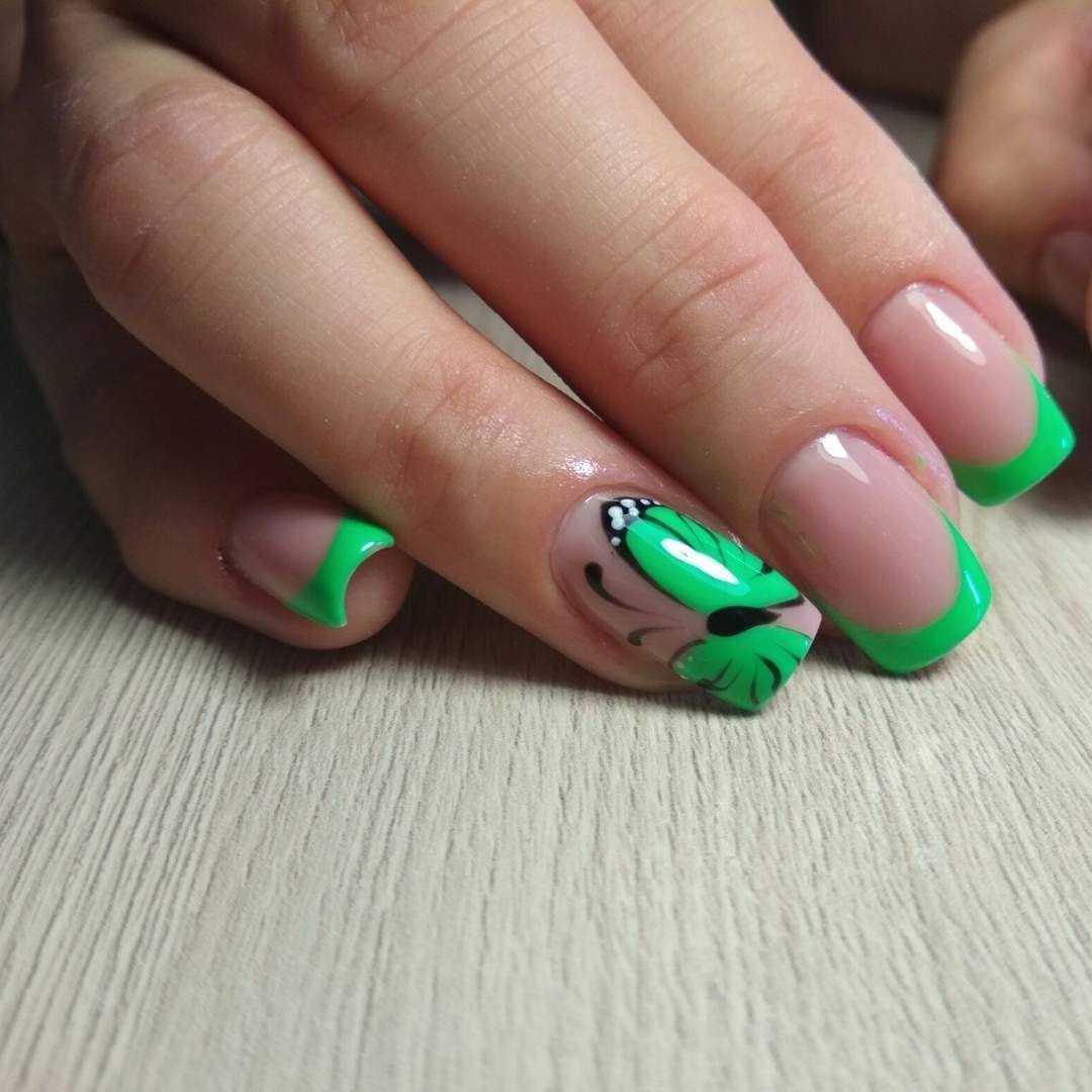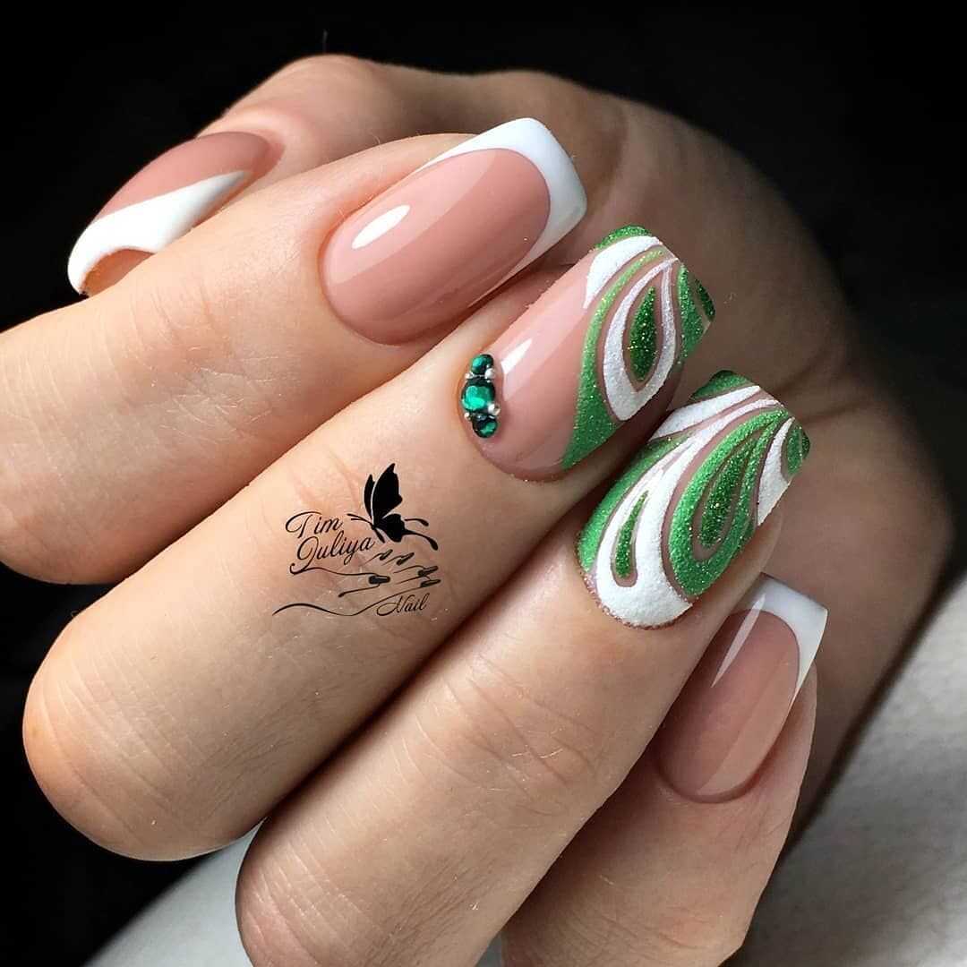 Зеленый френч отлично подходит ногтям всевозможной формы и длины. Мастера реализуют техники, чтобы маникюр органично вписался в любой образ. Используются всевозможные линии, геометрия, рисунки, а также украшения.