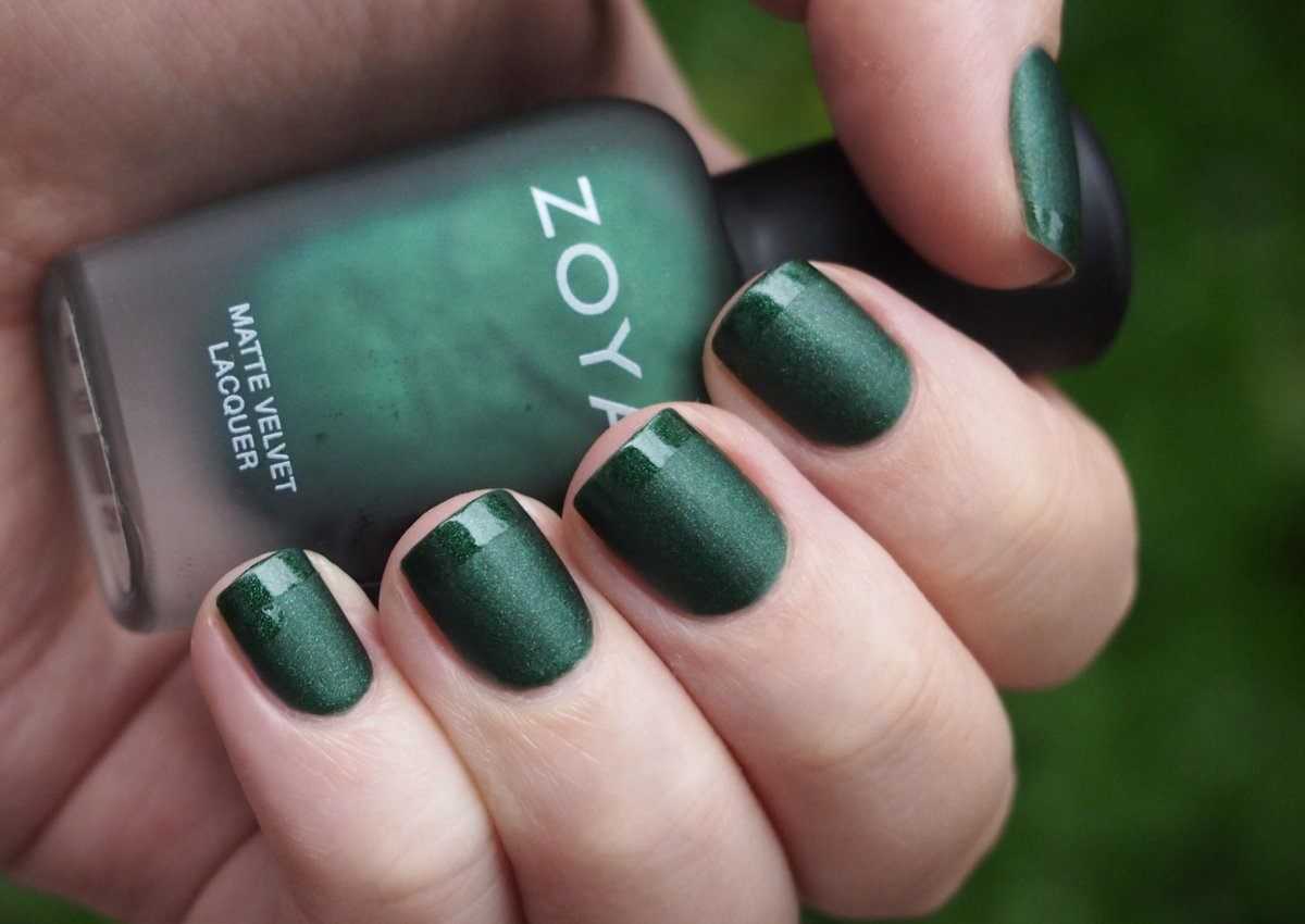 Любителям однотонных маникюров 2023 предлагает сочетать разные текстуры. Выкрасите ногти в любимые оттенки зелёного и покройте матовым топом.