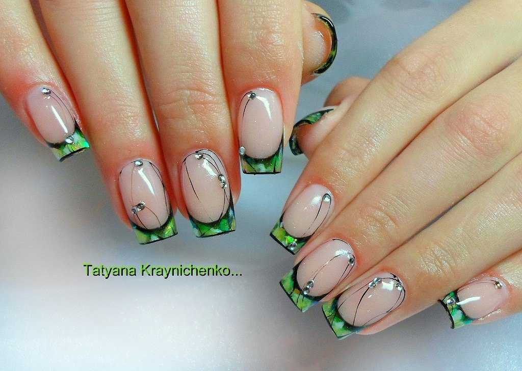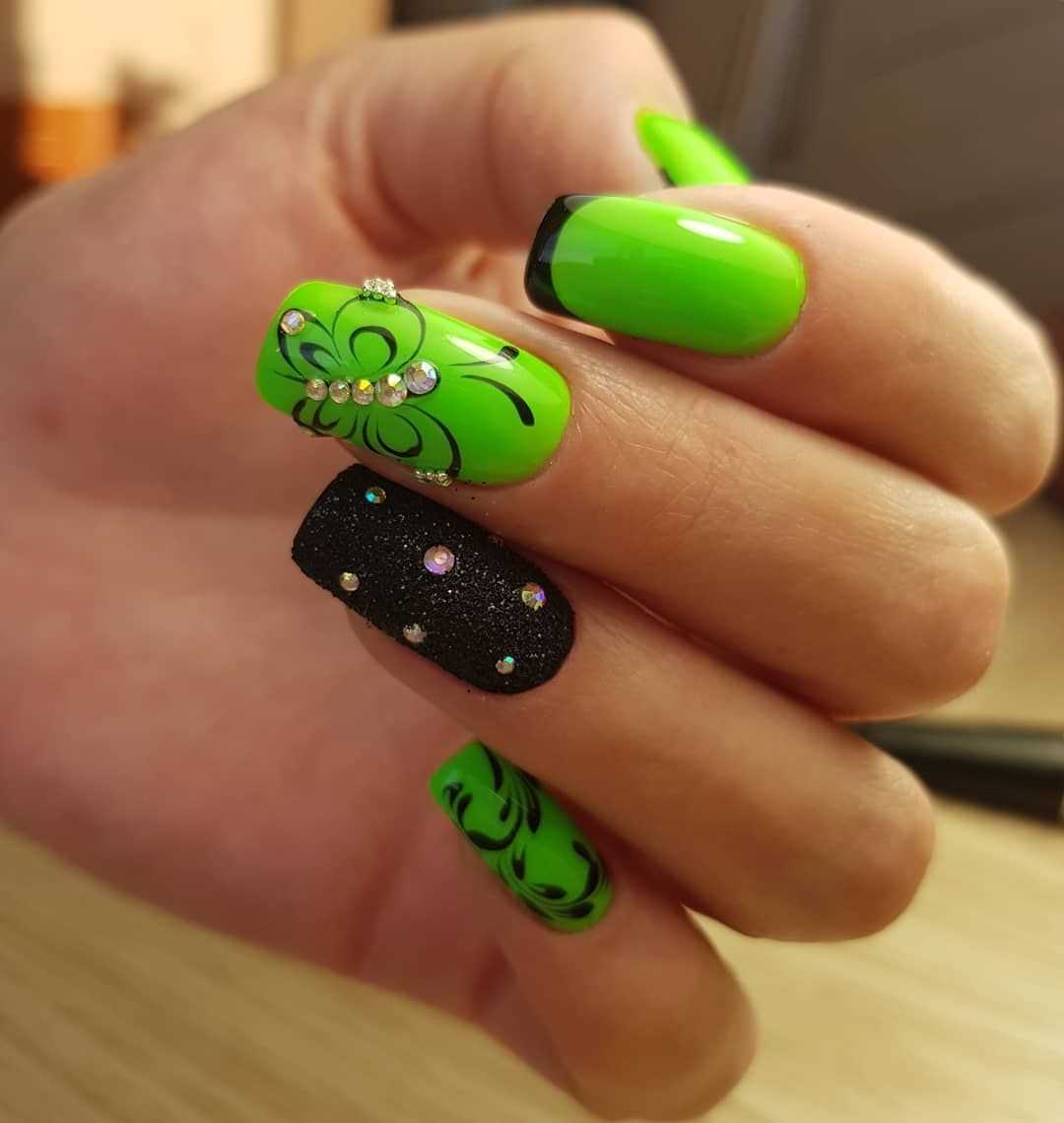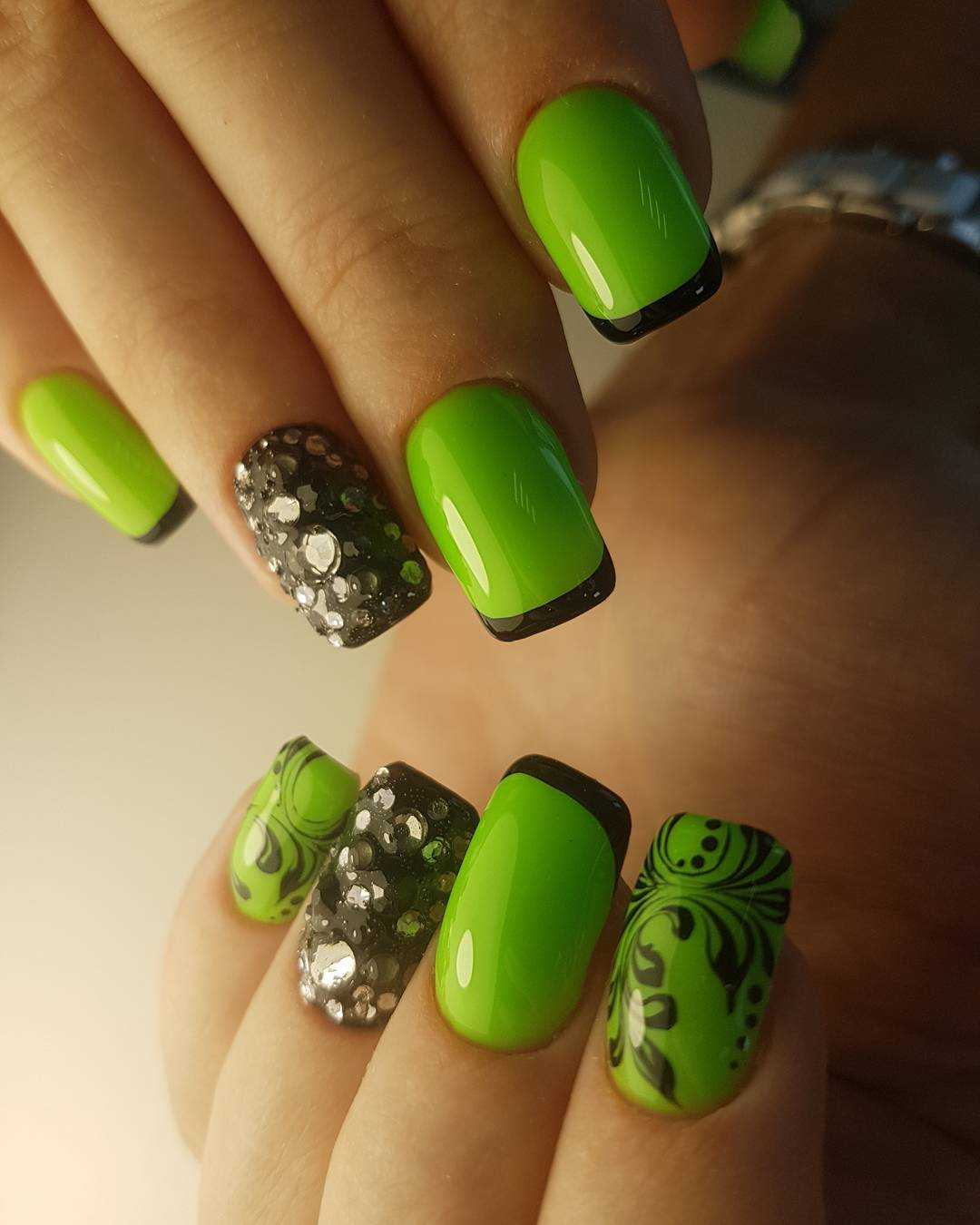 Черный маникюр модницы часто отвергают как очень мрачный. Сочетайте монохром с зелеными оттенками и ваш дизайн поразить индивидуальностью и необычностью. Отличные варианты — черная база и зеленая фольга, стразы, зеленая база с черными полосками пудрой или блестками.