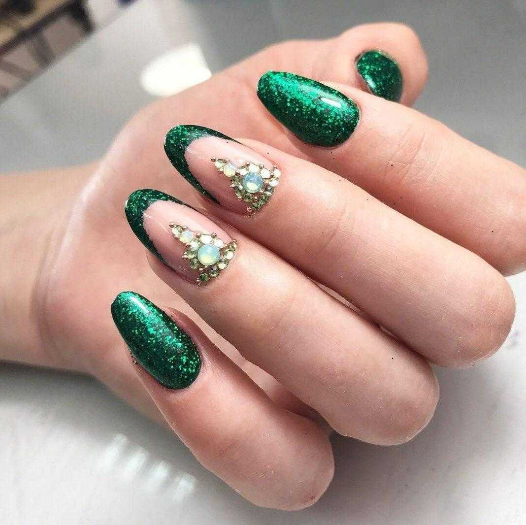 Актуальное течение в одежде и косметике – глиттер. Этот тренд предусматривает множество блестящих элементов, притягивающих взгляд своим мерцанием. Зеленое покрытие можно дополнить блестящими украшениями любых цветов. Либо наоборот, основу любой цветовой гаммы, разнообразить блестящими элементами цвета «изумруд».