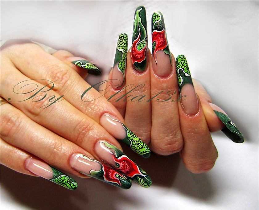 С красным сочетать зеленые очень сложно. Неправильно выбранный тон сделать маникюр не гармоничным. Вдохновляйтесь природой, там есть все подсказки. Ярко красному подходят густые и плотные зеленые, дополните маникюр блестками, фольгой или эффектом кошачий глаз.