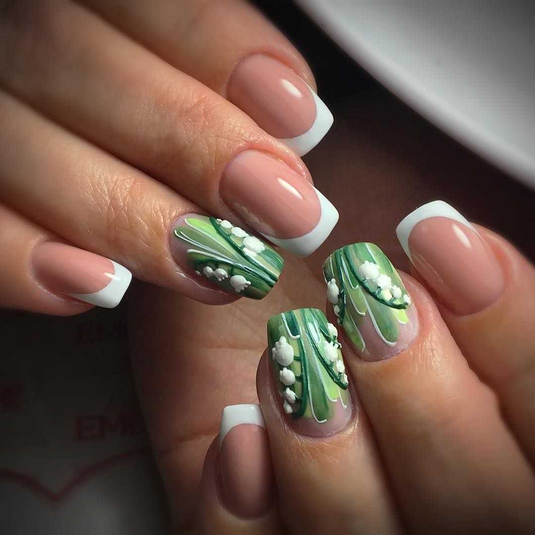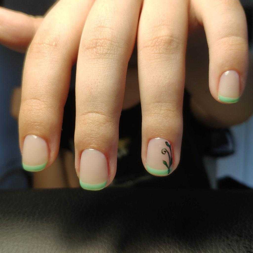 Классический френч с белой улыбкой лучше всего смотрится в сочетании с пастельными оттенками зелёного. Если хотите использовать салатовый, неоновый или изумрудный, покрывайте ногти прозрачным лаком. Цветниками прорисовывайте актуальную тонкую улыбку: на свободном краю или у одного из боковых валиков.