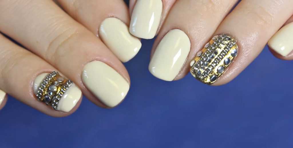 - Выполняя дизайн ногтей с золотом, декорации рекомендуется сажать на густую базу. По центру ногтя выложить линию из белых стразинок.