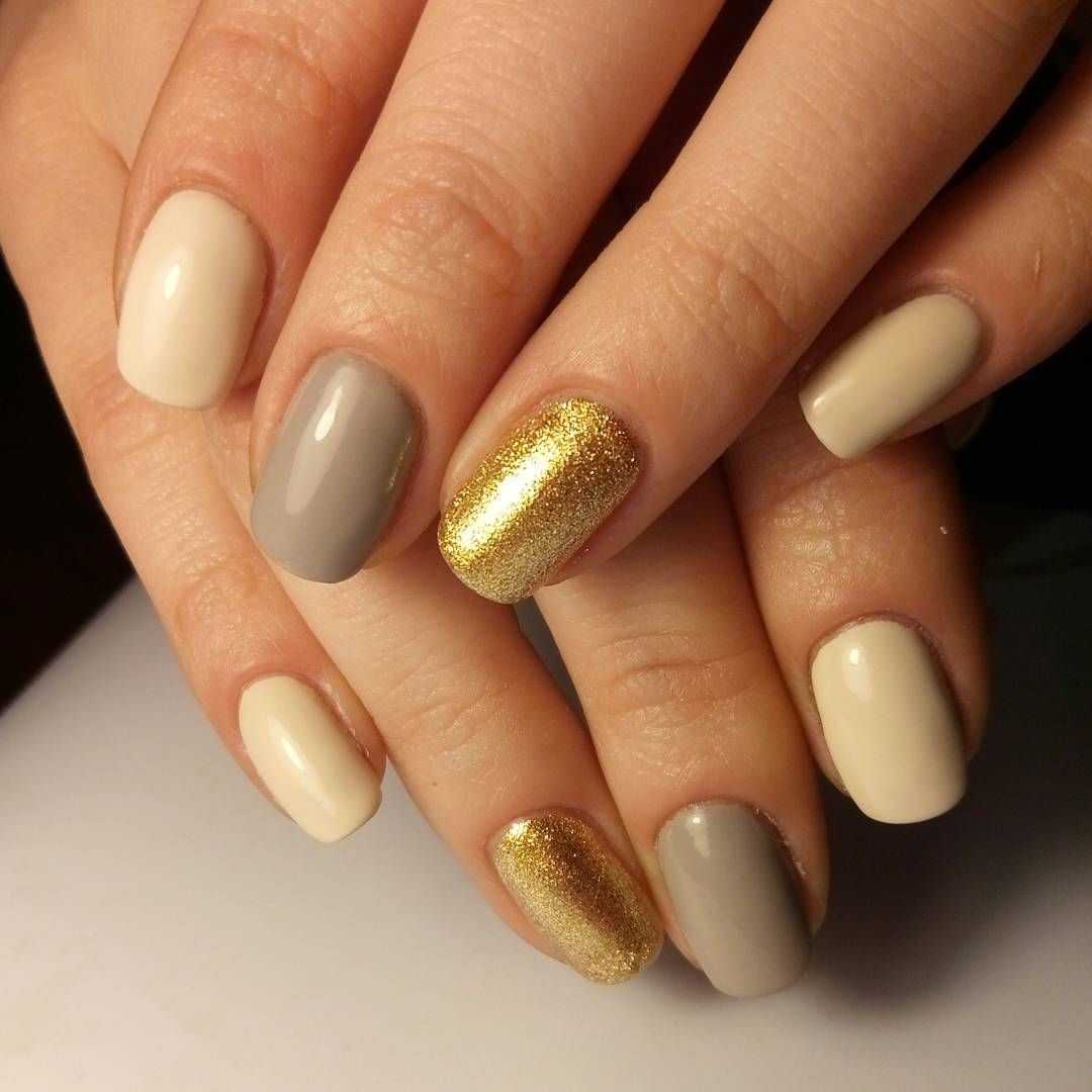 На пятом месте только набирающий популярность серый маникюр. Не каждый его оттенок будет уместен в обрамлении золота: например, стоит быть осторожными в отношении асфальтного и градации «бензин на воде». А вот нюдовый или пепельный серый вполне можно дополнить драгоценным блеском в виде улыбки или лунки, геометрического орнамента, лишь бы фон был равномерным и монохромным.