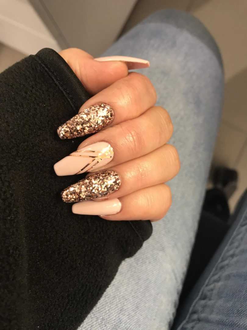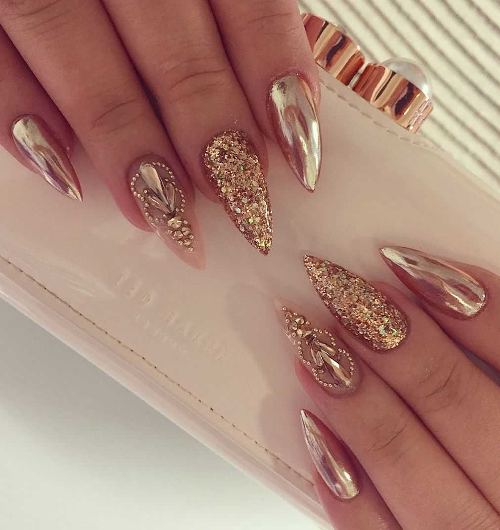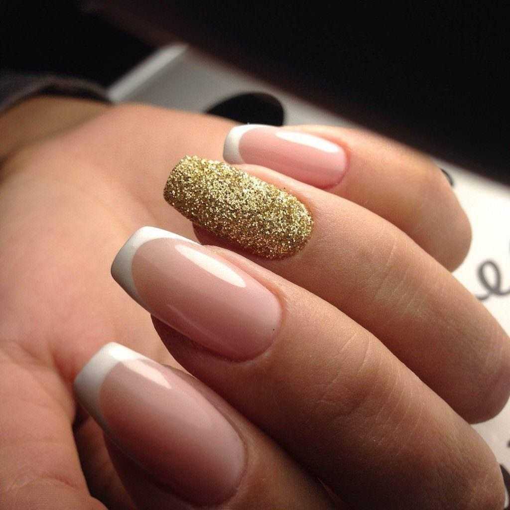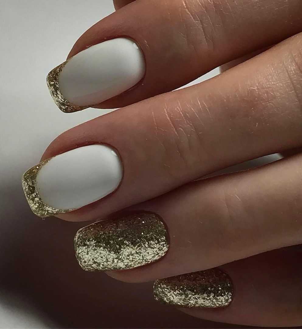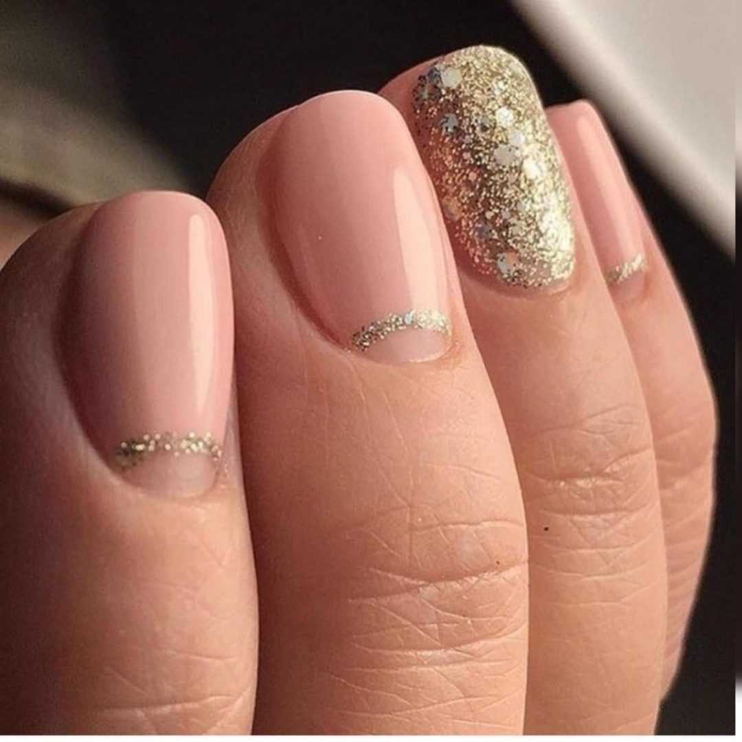 В этом сезоне стилисты и нейл-мастера рекомендуют выбирать ногти овальной либо миндалевидной формы и не отдавать предпочтение слишком большой длине ногтей. Здесь доступно множество вариаций дизайна: от минимализма и геометрии до блесток и камней. Золотое украшение для ногтей отлично смотрится на большой длине ногтей, это может быть дизайн с применением фольги, блесток, камней. Французский маникюр и лунный дизайн ногтей стали ведущими в этом сезоне. Такие решения в сочетании с золотом легко создать с помощью золотого глиттера. Для украшения ногтевой пластины также можно использовать камни, стразы и блестки.