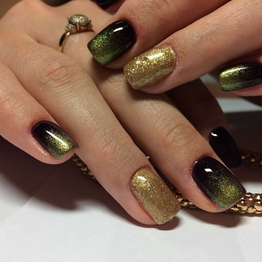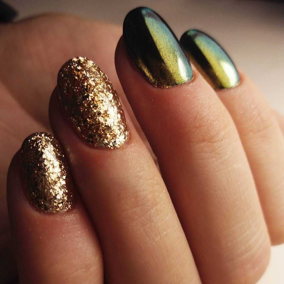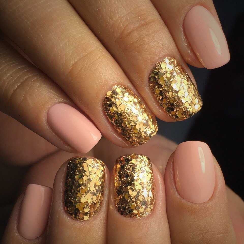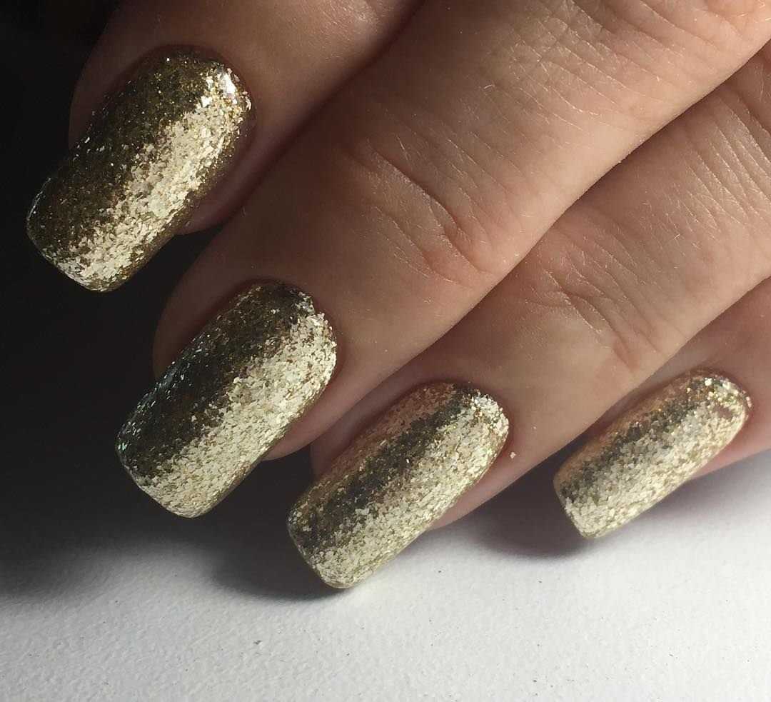 Для праздничных мероприятий и вечеринок такой способ оформления ногтей будет наиболее уместным. Золотой декор шикарно подходит для вечернего образа. Применять его можно разнообразными способами – вводить в виде глиттера и шиммера, фольги и потали, наносить втирку или топ с полупрозрачным мерцанием.