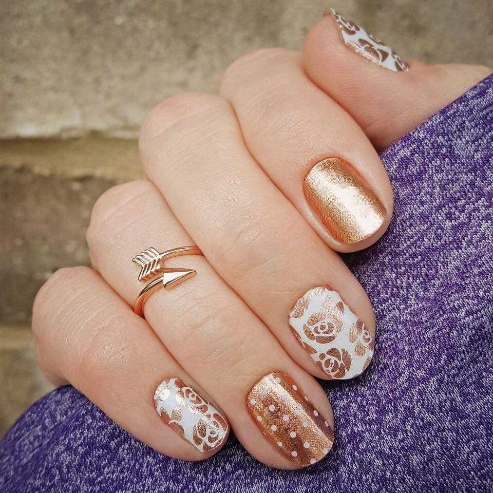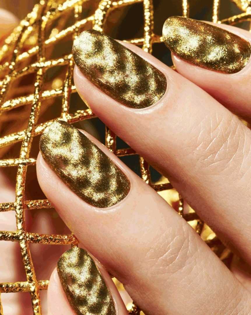 Если необходимо добиться равномерного покрытия, следует выбирать лаки с мелким шиммером. Также золото может иметь лаконичное или зеркальное воплощение. Профессиональные линейки включают в себя экземпляры с эффектом фольги, шелка или песка. Если вы хотите сделать простой золотой маникюр в домашних условиях, советуем приобрести твердое покрытие в виде наклеек – с ним легко работать, результат будет выглядеть довольно опрятно.